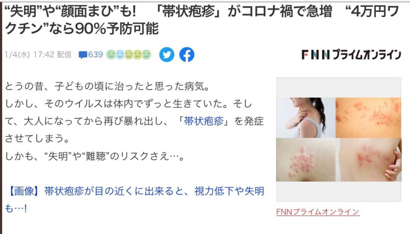 皆様こんにちは。年末年始、子供が咽頭炎で高熱を出し、治りかけでゴンゴン咳をしているのを見ていたら、どうやら私にうつったらしく「なんかぞくぞくする・・・」と思ったら37.8℃の微熱。あ、これ熱出るな…と思いながら、洗濯機を3回まわし、洗濯物を全部干してから野菜ジュースとリンゴジュースと体温計を持参してベッドにもぐりこみました。案の定、38.6℃の発熱、それからどんどん熱が上がり、一時は39.8℃まで・・・。「こんな高熱 久しぶりやな、10年前のインフルB以来やな」と思いつつ仕事はじめまでに間に合うかな?・・と心配していましたが、高熱は1晩だけで、無事熱が下がりました。葛根湯(満了処方)とカゼリックで対応しました。子供ほどではありませんが喉が腫れてて痛いのは、緑茶うがいと、イソジンうがいと、のど飴と、ビワ茶で対応。これだけでだいぶスッキリします。・・・とりあえず、いう事聞かなくて私にうつした子供には「自分で自分の面倒も見られんくせに、偉そうにすんな」と言っておきました。言う事聞かずに咳が長引いているわけですから・・・。なので、今日も養生の為、早めに休みます。さて、最近 帯状疱疹のワクチンのCMをよく見ます。新聞にもデカデカと帯状疱疹の記事やら、帯状疱疹ワクチンの広告が出ていたりします。帯状疱疹は水疱瘡のウイルスが体内に残存していて、例えばストレスが強くかかったり、疲れがたまった時などに出てきて悪さをします。加齢とともに免疫が落ちてくると、普段は抑制されているウイルスが出やすくなるとも聞きます。なので50代以上は、特に高齢者は免疫力が低下してくるので、帯状疱疹が出やすくなるのだそうです。うちの父も帯状疱疹が出た時には、麻酔医に行ってブロック注射をしてもらっていました。でも、50代60代ではあんまりそういうことなかった気がします。うちの家族もヘルペスを持っていて、疲れがたまると唇にちょこっとヘルペスができるので帯状疱疹やヘルペスってそんな特別なものじゃないと思います。・・・で、コロナのワクチンを接種した人では私の知っている限り、3/4の確率でヘルペスやら帯状疱疹が出ました。それってワクチン接種後に「自己免疫が落ちてる」って証左では?それで2回目の接種をやめた人もいますし・・・。この記事ではコロナ禍で急増とありますが皆、不思議に思わないのかな?そんなに多かった??特に免疫力のある若い人には帯状疱疹はそれほど問題にされなかったと思うけど・・・。少なくとも今ほどバンバンCM流れていなかったし、ワクチンワクチン言ってませんでした。なのに、急にどうしちゃったのさ・・・?そこで記事中に出てくる「シングリックス」という帯状疱疹ワクチンの出番です。4万円ですって。高価ですねぇ。なになに? 高価だろうが、効果があれば構わないって?(←シャレじゃありませんw)まぁ、見て下さいよ。このシングリックスワクチン。2018年に認可された、グラクソ・スミスクライン社のワクチンです。(↓クリックでソースにリンクします。:グラクソ・スミスクラインHP)帯状疱疹ワクチン「シングリックス®筋注用」承認取得のお知らせところがですねぇ、米国のワクチン副反応報告サイトVARES(ベアーズ)ではシングリックスワクチンを打った人の方が帯状疱疹にかかってるというデータがあります。VAERSについて背景と公衆衛生の重要性、ワクチンを扱う医療専門家1990年に設立されたワクチン有害事象報告システム( VAERS )は、米国ライセンスのワクチンで起こり得る安全性の問題を検出するための全国的な早期警告システムです。VAERSは、疾病管理予防センターによって共同管理されています ( CDC )および米国。食品医薬品局( FDA )。VAERSは、人がワクチン接種を受けた後の有害事象(起こり得る副作用)の報告を受け入れ、分析します。誰でもVAERSに有害事象を報告できます。ヘルスケア 専門家は特定の有害事象を報告する必要があり、ワクチン製造業者は彼らの注意を引くすべての有害事象を報告する必要があります。子宮頸がんワクチンのサーバリックスなどもそうですが(子宮頸がんワクチンはまだ薬害訴訟中ですが、接種勧奨始まってますね)海外で重篤な副反応が多数出てるワクチンでも、日本はそれを報道せずに、認可しているようなんですよねぇ?まぁ、抗がん剤といい、ワクチンといい、薬信仰、医者信仰の日本人はいいカモでしょうねぇ。日本では共産党の宮本徹議員がこんなツイートをしています。日本にはワクチン接種と診療記録を組み合わせたデータベースがありません。ワクチン接種でどのような副反応がでるか、小さなシグナルを検出できるよう、イスラエルや米国のようにデーターベースの整備が必要です。・・・言っておきますが、共産党もワクチン推進派なんですよねぇ。日本政府がデータベースの整備??? する気ないでしょうよ。コロナのPCR陽性者、感染者の国籍カウントだって「差別につながる」として、2020年5月に止めたんで