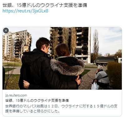 皆様こんにちは。日本がウクライナへの世界銀行の拠出金、15億ドルの連帯保証人になったニュースご存知ですか?↑画像クリックで、ソースのロイターの記事にリンクします。[キーウ 20 21日 ロイター] - ウクライナのシュミハリ首相は20日、世界銀行から15億ドルの融資を受けると発表した。日本政府が保証を提供するという。都合が悪いとドル建てで表示するんですよね因みに、2023.7.22現在の相場では15億ドル = 約2,126億7,545万7,252円です。そして私が違和感を持っているのは、あれだけ「人権」だの「自由」だの「平和」だのを持ち上げ、声高にいうG7をはじめ西側諸国が、どこもロシアやウクライナに停戦を呼びかけないことです。国連!!あれほどきれいごとを並べているのに常任理事国のロシアと、相手国ウクライナに対して和平交渉の協議をかって出ないのは何故ですか?しかもグテレス事務総長は、今年5月に国連の平和維持活動についてこんなスピーチをしています。(↓画像クリックでリンクします)(後略:全文はソースにて)ウクライナだって難民が発生してましたよ。日本に来た数人は、程なく行方不明になったようですけどね。平和が大事というなら、どうしてずるずると戦争を引き延ばすのでしょう。