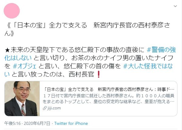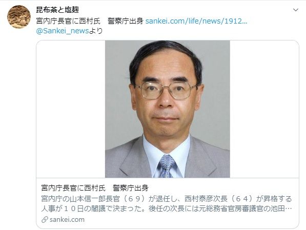 西村氏は東大卒で、昭和54年に警察庁に入庁。警察庁警備局長や警視総監、内閣危機管理監などを経て、平成28年9月に宮内庁次長に就任した。