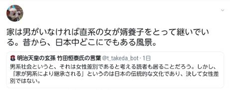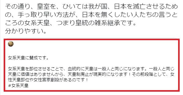天皇家は男系により継承される世界最古の家柄であるが 男系継承が困難だからといって女系天皇が即位したとしたら それは天皇ではなく皇統は断絶したことになる。 諸外国には女系の王を立てる国があるがこれを批判しているのではない。 女系が悪いのではなく天皇家に女系天皇はふさわしくないのである。