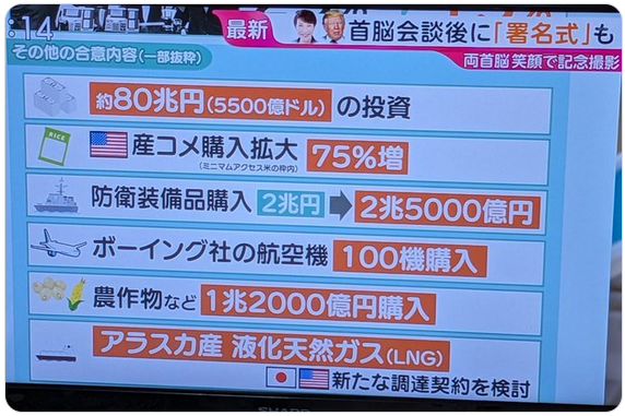 ②防衛装備品2兆5千億円輸入③🇺🇸産農産物1兆2千億円輸入④ボッタクリ価格のLNG契約⑤米国への投資(80兆円)