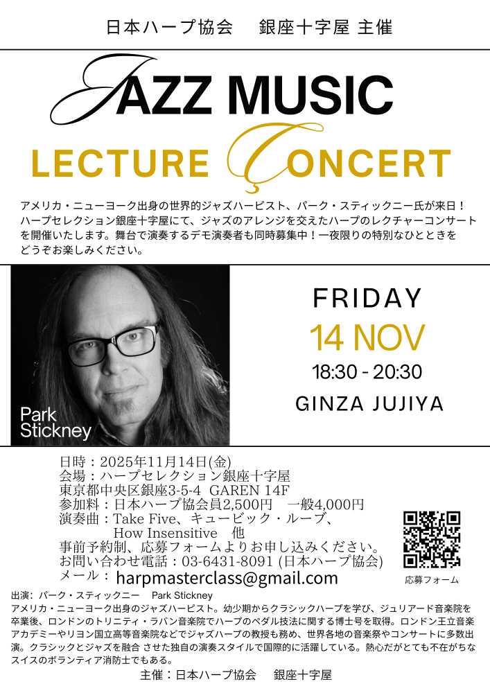 まだまだ暑い日が続いていますね。日本ハープ協会マスタークラスより、秋に楽しみなイベントのご案内です!世界的ジャズハーピスト、パーク・スティックニー氏の来日に伴い、11月14日(金)、ハープセレクション銀座十字屋をお借りして、レクチャーコンサートを開催させて頂くこととなりました!ジャズの名曲『テイク・ファイブ』や、ボサノヴァの巨匠アントニオ・カルロス・ジョビン作曲『How Insensitive』など、ソロのハープ演奏のほか、即興演奏の方法やコード進行など、実際にグランドハープを用いてレクチャーも行ってくださいます!今回は舞台上でのデモ演奏の方も募集します!プロの方もアマチュアの方も楽しめる企画かと思います。私もとても楽しみにしています。秋の夜長にぜひ銀座へお出かけください。どうぞよろしくお願いします。***世界的ジャズハーピスト、パーク・スティックニー氏レクチャーコンサート 開催!アメリカ・ニューヨーク出身の世界的ジャズハーピスト、パーク・スティックニー氏が来日!ハープセレクション銀座十字屋にてジャズのアレンジを交えたレクチャーコンサートを開催します。舞台で演奏するデモ演奏者も同時募集中!一夜限りの特別なひとときをどうぞお楽しみください。日時:2025年11月14日(金)18:30開演(18:00開場)会場:ハープセレクション銀座十字屋東京都中央区銀座3-5-4 GAREN 14F 入場料:協会員2,500円 一般4,000円(60名収容)演奏予定曲:Take Five、キュービック・ルーブ、How Insensitive 他事前予約制、下記の応募フォームよりお申し込みください。応募フォーム(9月4日〜)https://forms.gle/Xib8uJjR4JuQ2nxTA 出演:パーク・スティックニー(Park Stickney) アメリカ・ニューヨーク出身のジャズハーピスト。幼少期からクラシックハープを学び、ジュリアード音楽院を卒業後、ロンドンのトリニティ・ラバン音楽院でハープのペダル技法に関する博士号を取得。ロンドン王立音楽アカデミーやリヨン国立高等音楽院などでジャズハープの教授も務め、世界各地の音楽祭やコンサートに多数出演。クラシックとジャズを融合させた独自の演奏スタイルで国際的に活躍している。熱心だがとても不在がちなスイスのボランティア消防士でもある。 主催:日本ハープ協会、銀座十字屋