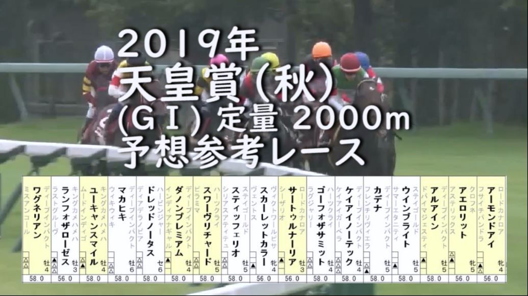 https://www.youtube.com/watch?v=TZMIy-yGbCI2019年10月27日(日)4回東京9日 11R 第160回 天皇賞(秋)(GⅠ) 定量 2000m2019年 天皇賞(秋)予想オッズ1 アーモンドアイ 2.02 サートゥルナーリア 3.53 ワグネリアン 8.54 ダノンプレミアム 9.05 アエロリット 15.06 スワーヴリチャード 17.07 アルアイン 22.08 ユーキャンスマイル 30.0動画の日付は新しい順です。2019年9月22日 阪神 神戸新聞杯 G29月1日 新潟 新潟記念 G38月18日 札幌 札幌記念 G26月2日 東京 安田記念 G15月26日 東京 東京優駿 G13月31日 阪神 大阪杯 G121018年11月25日 東京 ジャパンC G110月28日 東京 天皇賞(秋)G1最新の動画予想をご覧になりたい方は、Winning horse playerチャンネル登録を行ってください。◎2019年 天皇賞(秋)登録馬と過去の戦歴・戦績と予想コンテンツhttp://wwv.sakura.ne.jp/horse/2019tenno_syo_aki.png(※)登録馬より月曜日に制作されて動画です。出馬投票締切の結果、出走できなくなった馬もいますのでご確認下さい。c 2019 Winning horse player.
