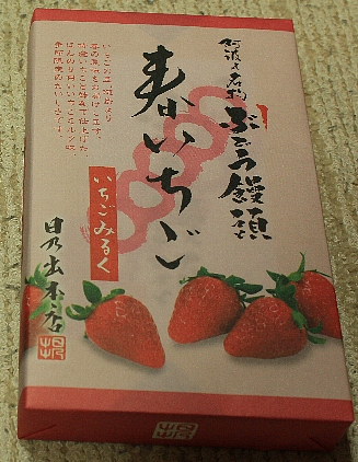 ぶどう饅頭~。でも、味はイチゴ味。その正体とは!?ま、ひらやんの住む市の特産物として「ぶどう餅」というのがあります。餅と饅頭と名称は違えど、中は一緒です。餡を餅皮で包んでいるんですが、それを長い串に刺して数珠繋ぎにすることで、見た目がぶどうの様な感じに仕上がっています。その餡の部分をイチゴミルク味にしているわけです。とはいえ、ひらやんの市の業者が作ったものではないんですがね