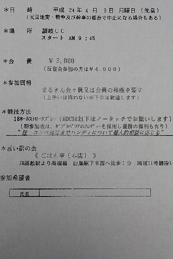 さきほど、オトン向けにFAXが届けられた。いわゆる、ゴルフコンペである。来月のようですが、その中止の場合の例として・・「天変地変」「戦争」、そして「幹事の都合」wコンペ終了後は「言い訳の会」も開催だとか