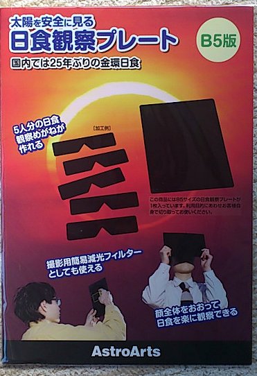 来月21日の金環日食に備えて用意しました。B5版なので、メガネを作ってもいいし、そのままプレートのまま日食を観察してもいい。デジカメの減光フィルターとして加工することもできます。ひらやんは一応、減光フィルターを作るつもりにしてます。あとはどう取り付けるかだなあ・・・。