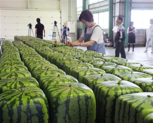 うどん県で恒例のスイカの出荷が始まりました!!そう、写真の通り、「四角スイカ」。これは実が小さいうちに、強化プラスチック製の透明の容器に入れて育てます。未熟な段階で収穫するため食用には向かないが、デパートや果物店の店先に並べる観賞用として人気があります。1玉約1万円。