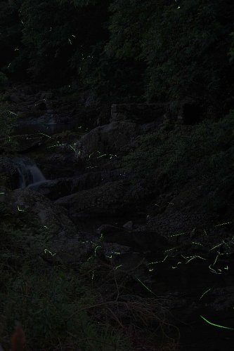 昨日の失敗を繰り返さないように・・・。さて、今日はホタル撮影日よりでした。@雨上がり@湿気が多い@風がない@月明かりがないこれを全て満たした本日。再び、昨日の場所を訪れ、ホタルが多く出没したポイントに移動。カメラを設置し、暗くなる前にちょっとヒマつぶし撮影。そして、本番に備え、背景のピント合わせ。19時40分ごろ、ホタルがチョロチョロと顔を出してきました。ホタルが増えるにつれて蚊まで出現!!撮影は蚊との闘いでしたヾ(〃>_<;〃)ノ イヤイヤ 途中、ホタルが目の前を通るので、捕まえて手の中で光らせたりして遊んでましたw今日の反省「やっぱりノイズ除去するように設定するべきであった・・・。」