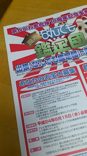 あのテレビでやってる「開運 なんでも鑑定団」が出張でこっちにやってくる!!実際に収録が行われるのは10月ですが、現在、出場者の募集が開始されています。んー、観覧をして目立つところに座ってテレビに映るとするかwでも出場したいけど、お宝がない・・・。どうしようか?贋作を今から作って出場するか Ψ( ̄∀ ̄)Ψケケケ