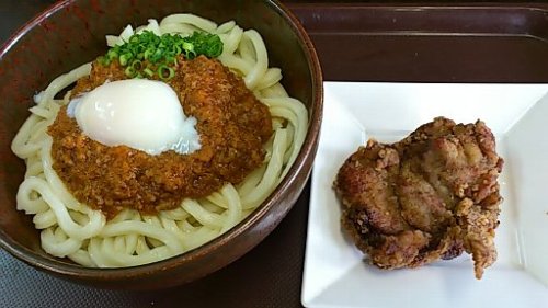 見ましたか?今日の昼の「うどん県への挑戦状」を?ひらやんはさきほど録画を見ました。ナニコレ珍百景に続いて、またしてもこの番組に登場した「赤坂製麺所」の名物おばちゃんw笑わせていただきました(≧∇≦)ノ彡 バンバン! 全国にいろんなうどんがあれど、やっぱり讃岐うどんを愛し続けるひらやんなのであったwさて、今日の昼に食べたうどん。「肉味噌温玉うどん」+「若鶏のから揚げ」