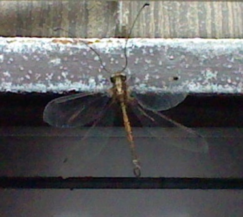 初めて3DSで写真を撮ってみた。家の裏口にいたこの生き物・・・トンボではないよな?蛾??トンボと蛾の愛の子??情報を求む。