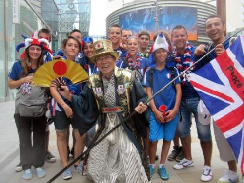 いつも大相撲のときに金の扇子を振って応援している会長さんじゃないですかw今は「オリンピックおじさん」ですがね。ロンドンに出没してらっしゃるんですね。元気いっぱい!がんばってきてください!!なんでも、なでしこが目的だとかw
