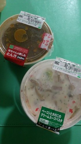 夕方からお出かけしていたのでコンビニで買ったものを食べました。三ツ星パスタと石原軍団が被災地で炊き出しした豚汁