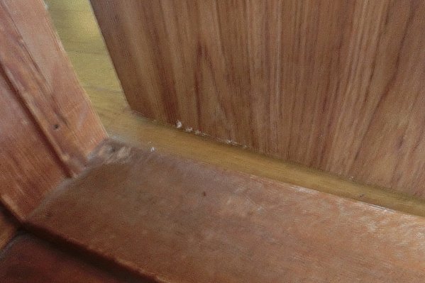 部屋のドアが枠に対して傾きがあり、一旦閉めると角のあたりが枠に擦れて開きにくくなるために直すことにしました。ドアを外します。おや?これは昔、他のドアがついてたってことやな?見てみると、ドアを違う材質で組み合わせていることがわかります。カンナがないので、コツコツと彫刻刀を使って削ることに。しかし、角の部材が固いので、やむなく工場からサンダーを持ち込んで一気に削り取ることにしました。部屋がちょっと焦げ臭くなりました思った以上に削れてしまいましたが、まあええかドアを取り付け直して、事のついでにスプレーしておきました。