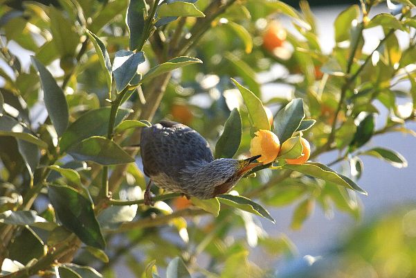 ひらやん家の庭で、人間よりも早く金柑を食べ進めているやつがいる・・・・。ついに、現場を押さえたーーーーーーー!!2羽ほど来てるヒヨドリや~~~~!!
