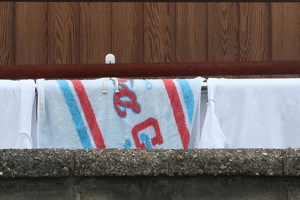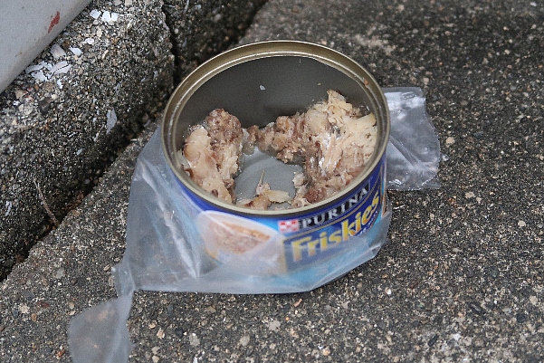 裏庭のブロック塀の内側に誰かが猫のエサを置いてあるのを発見!!