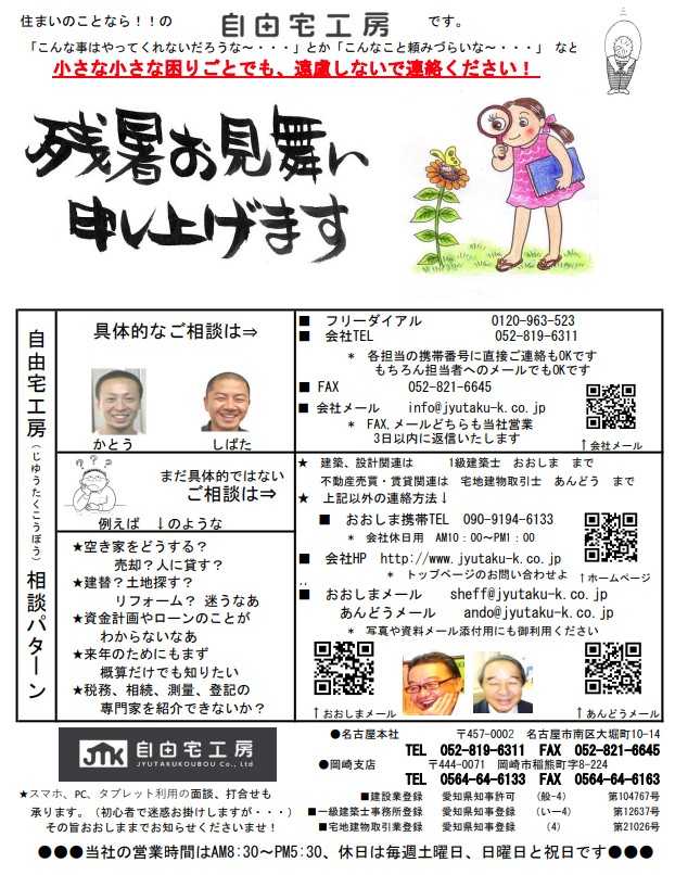 暑中お見舞い申し上げますじゆうたく考というマンガコラムです。今回のテーマは【天井で遊べ】原作・編集:シェフオオシマ脚色・作画:エトーユキさん■人気ブログランキングの愛知県のランキングにブログ名 『シェフオオシマの住宅雑記帳』 で登録しています。6位~15位あたりにいますので クスッとしていただくか または『なるほどー』と思って ランキング内のブログ名をクリックして いただけたら感激!! ↓ここから⇒ 人気ブログランキングそして用語辞典は【じゆうたく用語辞典 「さ」】●サニタリー●・衛生的な、という意味ですが 現実にはジメジメシテイタリ カビが生えやすかったり 非衛生的な空間に なりやすい場所。●三顧の礼 (さんこのれい)●・住宅業界では ありえない?? 2度の依頼を受けずに 断るなんて!・メーターモジュール設計のとき平面図で よく見ることのできる寸法表示の部分。 例えば 1,000とか 2,000 ⇒さんこのれい:三個の零 ●在来工法● Wikipediaによると~ 1964年10月1日に日本初の新幹線「東海道新幹線」が開業したが、それまで新幹線がない時代には「在来線」という言葉や定義はなかった。~ これにならうと~ 19★★年◎月△日に日本初のツーバイフォー工法が上陸したが、それまでツーバイフォー工法がない時代には「在来工法」という言葉や定義はなかった。~それではまた!