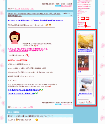 Q.ニックネームを変更したのに、「○○の日記」の箇所が変更されていない!「○○の日記」部分を変更したいんです。教えてマスター------------------------------------------------------------------- 前回と同様、ニックネームについての質問ね。 りょうかいしたわA.日記のタイトル(「○○の日記」の部分)については、 ニックネームとは別に変更する必要があるのよ。下の手順で設定をしてみて■日記タイトルの変更方法■1.楽天ブログ管理画面にログイン2.ページの設定 >> 日記 >> 日記/記事の基本設定 を選択3.「あなたの日記 / 記事のタイトル」の欄に、希望するタイトルを入力4.「◎設定を変更する」ボタンをクリック5. 完了よあと、日記のタイトルはあなたが「お気に入りブログ」に登録している相手の、管理画面の「日記掲載サイト」にも表示されるタイトルになるわ>>楽天ブログでよくあるお問合せはこちら>>楽天ブログへのご要望はこちら