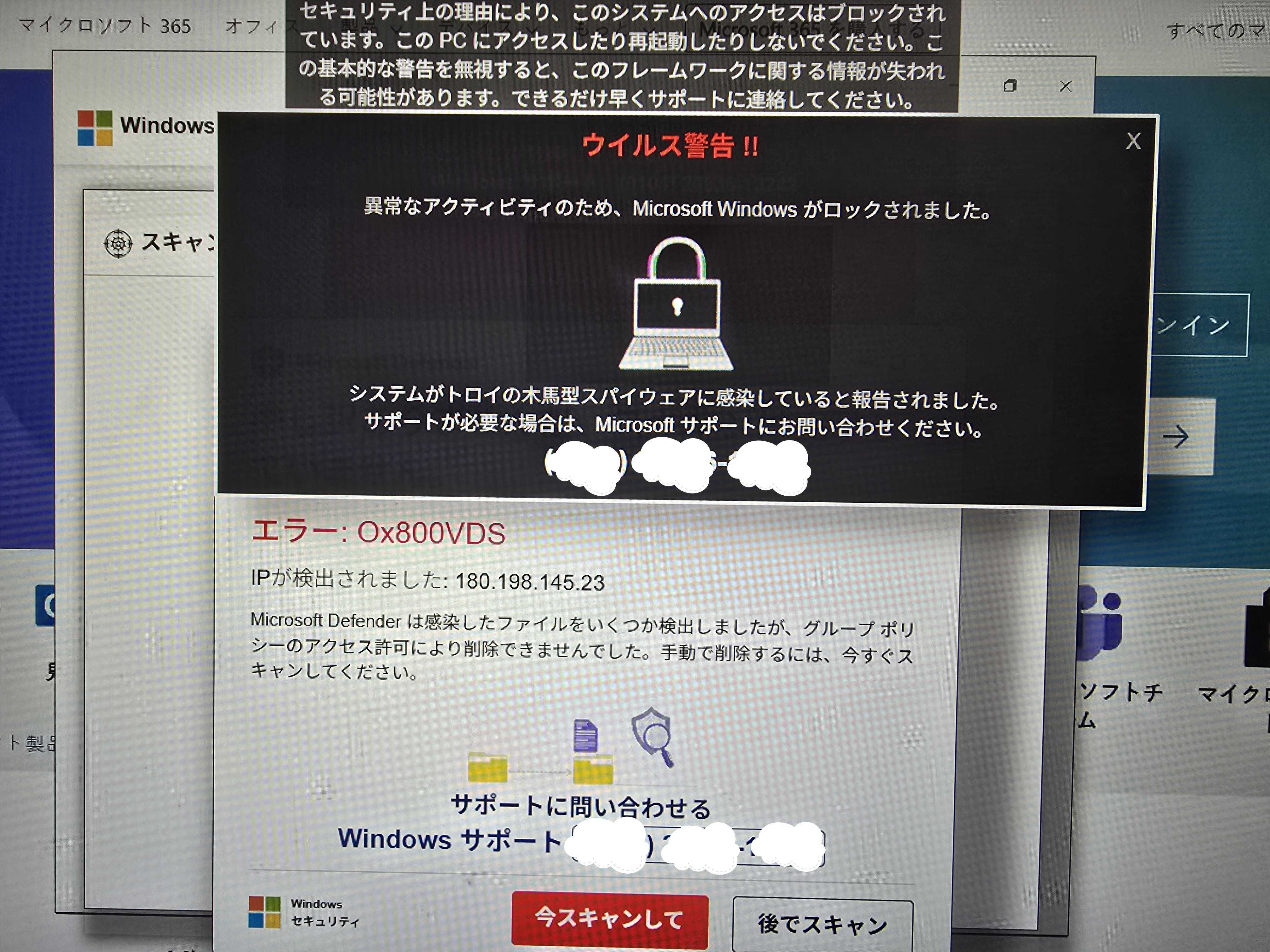 ある日、調べものをしていたら、急に画面が変わって、普段、ミュートにしてあるパソコンが話し始めた何事かと思ったら、エラー音ともに何やら喋っていたけど、ハッキリ言って覚えてないでも、うるさくて、イラっとしたので、即 Ctrl+Alt+Deleteで、強制終了あ~しまった写真撮ればよかった~と、ちと、反省再起動して、しばらく調べものしていたら、またも、鳴り始めたシツコイわと、今回は、冷静に写真撮ってみましたよ大体、サポートの電話番号長すぎ(4桁)5桁-5桁でも、詐欺とはわかっていても、いきなり、画面が切り替わると焦りますね別件ですが・・・息子君の携帯に近頃、詐欺の電話がかかってくる。学校に行っている間とか、留守電にメッセージ入ってて「お客様名義の通信機器が2時間以内にすべてがストップします。お問い合わせ先は~」申し訳ない。息子君名義の通信機器は、今現在、1台もない勝手に好きなように止めればいいさ