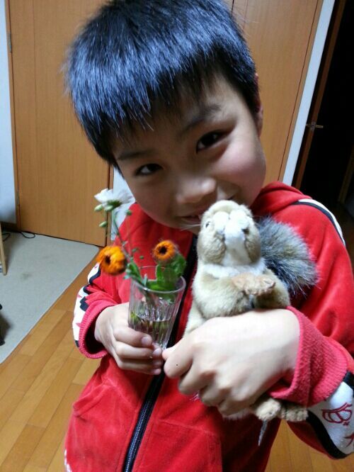 旦那さんの家族食事会。早めの母の日に花束を。美味しい手料理の前に割れないシャボン玉で遊んでくれた。興奮する。私。