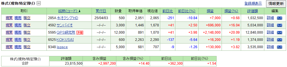 トランプ関税、分かっていたけど何だろうこの暴落は今朝5時過ぎに目が覚めたときに確認した日経先物は+500円くらいだったのに、6時過ぎに起きて見たら-900円オーバー。ナニコレ流石に今日は喰らったかと思いきや、QPSとサンバでプラス域。QPSちゃん、頼みますGNIは損切り。半導体、そろそろ欲しくなっちゃうんだよなー、キオクシアとコクサイを思わず買い。今日のポートフォリオ