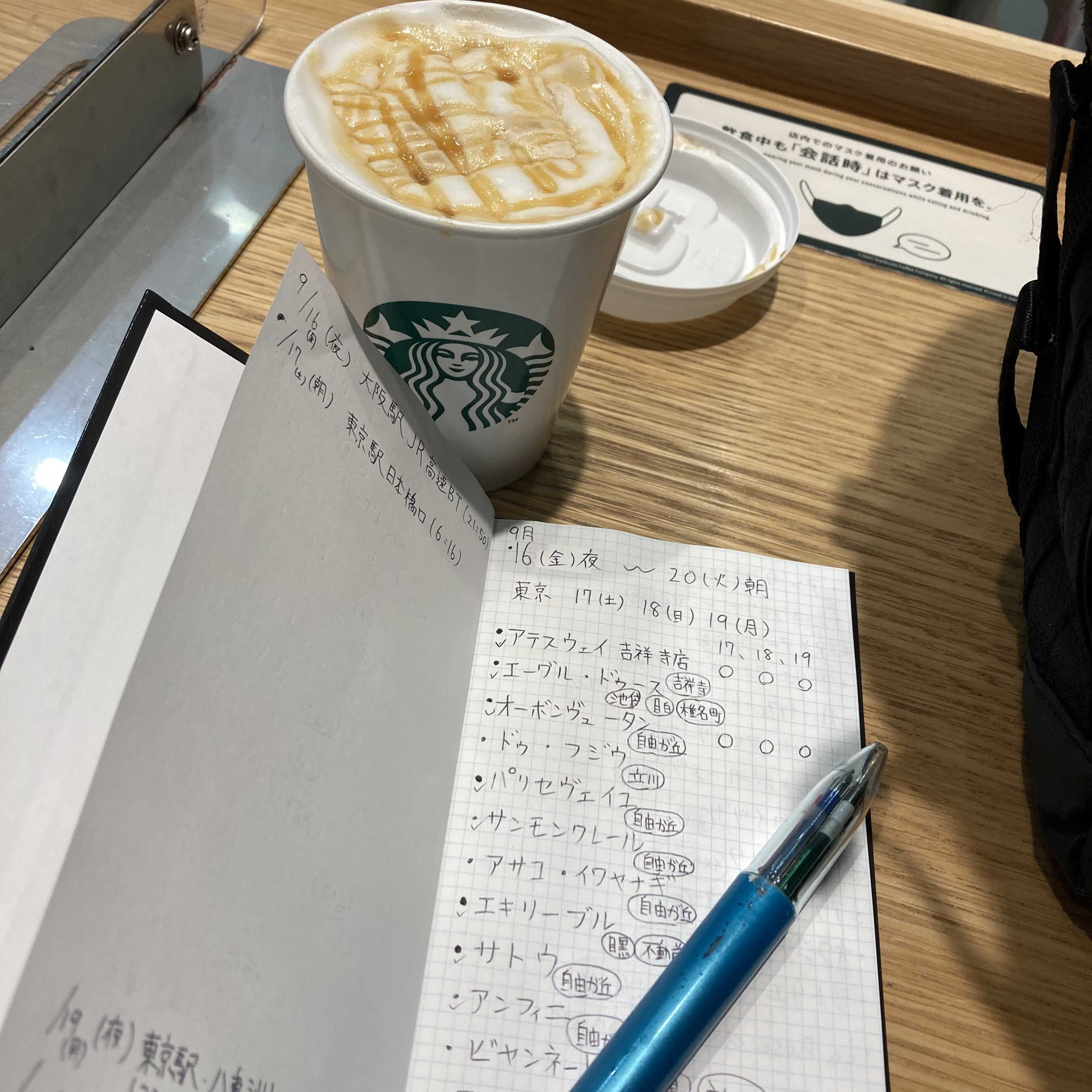 〈仕事終わり東京へ直行。〉〈東京食べ歩き〉世間的に忙しいイメージの強いパティシエ。世間が連休でも汗水流して働いてるイメージ。僕も過去を思い出すと働いてた記憶しかないです。今回、奇跡的に三連休を頂いたので、5~6年振りに東京へお菓子の食べ歩きに行くことにしました!少しでも東京の滞在時間を増やしたい!お金を節約してたくさんお菓子を食べたい!ということで仕事終わりに、夜行バスで東京笑2日間東京にいる親友の家に泊まって、連休明け仕事の前に夜行バスで再び大阪に帰ります😆自分でも思う。なかなかなハードスケジュール。🤣親友には2日間も泊めてもらうので、務めてる店の焼き菓子詰め合わせ。残りの空いたスペースに関東には恐らくない、関西だししょうゆ味のポテチ。をめいいっぱい詰め込みました!帰りは空いたスペースに焼き菓子お土産を詰め込む予定です!〈明治神宮〉夜行バスなので早朝に着いたので寄りました✌️〈作戦会議〉明治神宮に行ったあとも時間があるので人生初、1人スタバ今日の食べ歩きの作戦会議を1人でしてます🤣