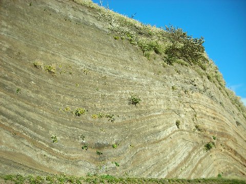 この三連休(11/22~24)を利用して、東京都の離島である伊豆大島と、ここから最も近い本土である伊豆半島の伊東市を訪れてみた。(その7)間伏地区の砂の浜を観光後に、地層断面と呼ばれる名所にむかう。ここは道路の開削工事に伴って発見された見事な地層面が露出している場所である。 「間伏地層断面」バウムクーヘンのような見事な露頭である。私は地質系の知識は無いので褶曲なのかなんだか良く判らない。 同じく間伏地層断面。駐車場が近くにないので車の場合は路側帯に停めて観光するほか無い。こう言うときにバイクは小さいので気楽である。うねりが続いているような地層である。案内看板によると褶曲でな無くて堆積によるうねりとの事。 海の方を眺めてみると、大島の南に浮かぶ利島と新島が見える。円錐形の島が利島でその右側にある平べったい島が新島だそうである。この辺りだと特に利島は大きく見える。 ついに元町まで戻ってきた。桟橋の先にある元町港燈台を写してみる。小振りな燈台である。この元町港からは東京や久里浜、熱海方面など各種船舶が発着する。風が強いので桟橋も浪をかぶって濡れていた。 振り返って山の方を写す。この三原山ももう少しで見納めである。このアングルからの三原山が一番落ち着いて見える気がする。お世話になったレンタルバイクを返却して熱海行きの船に乗ることにする。これで大島ともおさらばである。駆け足であったが色々楽しめた。今日は元町方面の風が強い為に船舶の運航は岡田港となっている。元町港から路線バスに乗って岡田港へ行く。 今日の船は虹色に塗られた高速船であった。熱海までたったの45分である。お値段も特急料金なのか片道五千円もする。揺れもなく快適な船の旅であったが、ほとんど寝ていたので途中の記憶がない。熱海入港を告げられて目を覚ますと、眼前に熱海の温泉ホテル街が聳えていた。(明日に続きます)
