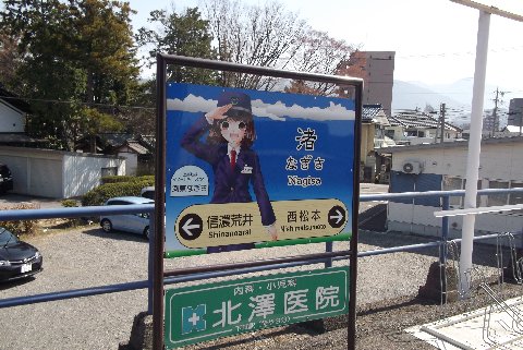 平年より1週間ほど早い桜の開花となっているが、花冷えで寒い日も多いためか花が長期間に渡って見ることが出来ている。13日、満開の桜を見に松本城周辺へ行ってみることとした。市内中心部はいつもなら自家用車で行くのだが、気分を変えて自宅から少し歩くとる松電上高地線の渚駅から電車に乗って松本駅まで出る。 アニメのキャラクター風で最近人気が出てきた「渕東なぎさ」が入った眞新しい駅名標になっていた。 渕東なぎさの駅名標アップ。名字の「渕東」も名前の「渚」も上高地線の駅名から採った。地元紙の報道に依ると、松電の女子社員の発案らしい。既にキャラクターグッズも売られている。最近はゆるキャラやアンメヒロイン系など色々なキャラクターで各地で観光誘致活動が盛んである。渚駅から上高地線電車でわずか3分ほどで松本駅へ着く。此処から路線バスで数分乗ると松本城前(大名町)へ着く。お城周辺は満開の桜で観光客も多い。団体観光バスもたくさん来ている。 お城の内堀の周りを一周して桜を楽しむ。城跡には全国どこでも大概桜が植えられておりこの時期には観桜で賑わう。(次回に続きます)