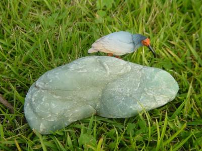 ザ・ヒスイ-コレクション2は、青ヒスイ(ブルー・ジェイド)です最長部=約12cm。重さ=約380g。採集場所;H川下流域去年の夏。昼過ぎ、もう帰る時刻が近づいて、あと探せるのは一カ所。(ヒスイって、本当に採れないんですよ、皆さん)移動してみると、ちょうど目の前を老人が二人、ヒスイを探してる。仕方ないので、その二人のすぐ後ろを追う形で貴重な時間をつぶしながら、探す。「あ~あ、何やってんだろ、俺・・・。 こんな超ベテランの後ろで採れるわけないジャン!!!」暗い気分で歩いていると突然、ヒスイ独特の光が川底から。おおっ!ヒスイじゃん!と思うより早く、つかんでた。でかい!海で過去2度、青ヒスイを採集したことがある。翡翠屋のおやっさんがナゼかくれた青ヒスイ1個がある。その3個とは、比べものにならないくらいデカイ。欲しかったタイプ。(ちなみに疑り深いあなたのために、しっかり専門家には鑑定してもらってある)・・・青ヒスイはコバルトヒスイとも呼ばれています。某HPには、「青ヒスイは、採ろうと思って採れるものではない。日本だけのヒスイ。人気はそんなにナイ。」とある。オレは思う。どのヒスイにしても、ねらって採れないよ。青いのは、ミャンマーでも採れてると思うけど・・・。どうなんだろう?(青ヒスイは最近、人気あるそうです!)卑弥呼が中国に送った青い石というのはこれじゃあないのか?オレはH川で採れたことに、海岸転石とは違う、スンゴイ意義を感じてます