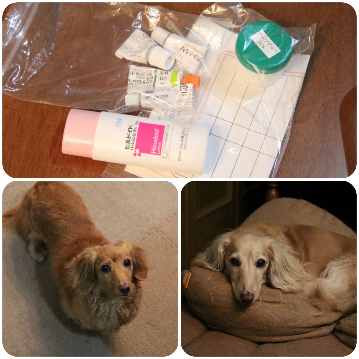 6/27朝の体重:プチ4.7kg大地5.2kgメレ4.5kgミント5.7kg********************************************************昨日はHITONの病院DAY実は3月の森まきキャンプの後で膝下にぶわーっと湿疹ができてしまって膿んで崩れた3か所が深い傷になったのを週2で病院へ処置してもらいに通い続けて・・・5月半ばからやっと2週間に1度になったの。花粉症の自覚症状は無かったけど湿疹の原因はアレルギー(スギ・ヒノキ・カビ)じゃないかって来年からは花粉の飛散する時期に合わせてお薬を飲んだほうがいいと言われたよ(キャンプのときにもアレルギーのお薬を飲むようすすめられました)昨日は病院がすごく混んでて帰りが遅くなっちゃった虫よけスプレー作ったり・・・キャンプの準備したかったのに何もできなかったまぁ、ビール飲んでのんびりしちゃったからっていうのもあるけど(笑)プチ大地メレミントもお留守番長くなっちゃってごめんね。とりあえず今朝、虫よけスプレーは作ったよあとは今夜頑張ろう・・・多分ガイロープを使ってハンドメイドしたいものもあるの。完成したらアップするねプチ大地メレミントに応援クリックよろしくお願いします( 別ウィンドウが開ききるまではそのままでお願いしますm(_ _)m )Instagram登録してみました~プチだいメレミンすたぐらむ 画像をクリックすると移動します今までのハンドメイド作品をまとめました 画像をクリックすると今までの作品をご覧いただけます*******************************************************