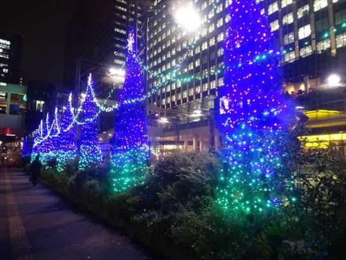 JR大崎駅前にある「シンクパーク」では、ホワイトとブルーの電飾が使われ、樹木のイルミネーションが美しいのです。線路側から。そしてフットサルコート側から。葉の落ちたケヤキの木々もLEDの電球でお色直し。枝の所々に大きな星の輝きが。青とピンクが仲良く。青と白の幻想の世界。ビル入り口のガラスにも青のイルミネーションが映っていました。青の下に緑の輝きも。5色が輝きを競い合っていました。ピンクもすらっと。幻想の林。見る場所が異なると輝きの色合いも微妙に変化。青の木々が白の輝きに繋がれて。青と緑の輝きの下の水の流れも輝いていたのでした。