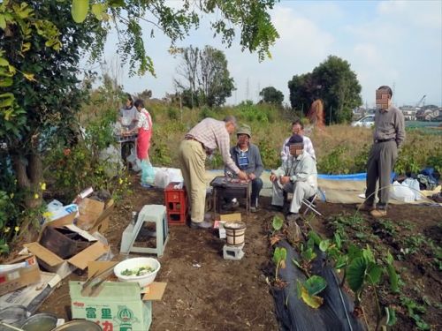 今年も、我が農園で高校時代のクラス仲間で芋煮会を行いました。今年は総勢10名。クラスのマドンナ3名そして初老のオジサン6名。そして我が会社の若き同僚も1名参加して下さいました。初デビューはYさんそしてTさんの2名。茅ヶ崎からのYさんが、庭で実った柚の実をたくさん持ってきて下さいました。準備の先行隊は9:30に地元の駅に集まって下さいました。そして9:00からオープンしているスーパーで買い出し。我が農作業車で数回、農宴会場までピストン輸送。九州・伊万里の親友からご自分の農園近くで捕獲した猪の肉もタイミング良く送って下さいました。前処理がきちんとされており、臭みも全くなく美味。網で焼き、塩こしょうを振って楽しみました。そして。この日は残念ながら不参加となりました単身赴任中の上司のTさんが仙台にお住まいの奥様にお願いして、大量の生牡蠣を。参加された同僚のKさんが、殻剥きに大活躍。炭焼きで楽しむ方も、そして血液型B型の人間は生牡蠣に柚汁をかけて楽しませていただきました。牡蠣も猪肉もあっという間に完食。そして芋煮。材料の里芋、大根、ニンジン、ネギ等は全て我が農園から。マドンナ二人が里芋の皮を一つ一つ剥き奮闘して下さいました。我が農園の山芋の蔓に出来た零余子も収穫。茹でた零余子にスライスした我が農園のニンニクで炒めました。そしてこれを割り箸で一粒一粒挟んで楽しんだのです。まるで数年?後のリハビリを想定した事前訓練のごとし(笑)。そしてこれも我が農園から収穫した秋の味覚、食用菊も柚汁をかけて楽しんだのです。珍しさとシャキシャキとした食感が好評でした。何故か銘柄指定のアサヒビールそしてハイリキ、ワインを楽しみながら、サンマの塩焼きをこれも柚汁をかけて更に焼きそばも楽しんだのでした。この頃は私も酔っぱらい写真撮影はどこかにすっ飛んでいました。現役の大学教授、そして商社の米国支社長、海上自衛隊護衛艦艦長司令官等々凄いキャリアの『兵(つわもの)』が今年も参加してくれたのです。15:30頃まで、農宴を大いに楽しみ、年金の話や病気の話、そして同級生の近況、もちろん孫の話も、そして何故か私の同窓会すっぽかし事件の話等で盛り上がったのです。気がつくとお開きの予定時間があっという間に。そして来年もこの農宴の再開そして再会を約束して宴を閉じたのでした。最後に全員で記念の集合写真を撮りましたが個人情報ですので。この日は全員がすくっと立って、誰一人ととして支えられる初老のオジサンの姿は無かったのです。皆さん数年前のあの日のこと?がトラウマに?? マドンナの皆さんそして希望者には、里芋を掘りお土産に持って帰って頂きました。 そして翌早朝は小雨の降り始めた中、慌てて『奥の畑道』の『兵どもが夢の跡』の片付けを行ったのでした。『夢の跡』も、何時ものような静かな畑道に姿を取り戻したのでした。参加された皆さんから多くの無事帰宅の報告そしてお礼のメールを頂きました。『農園の元気な野菜をたくさん、新鮮な牡蠣や猪の肉など珍しい美味しい物をごちそうさまでした。あの場所で芋煮会を開き、炭火で秋刀魚を焼き、焼きそばを頬張り、とても楽しいです!あの場所がなんと言っても落ち着くのです。また次回、みなさんと元気で集まりたいです。』と。