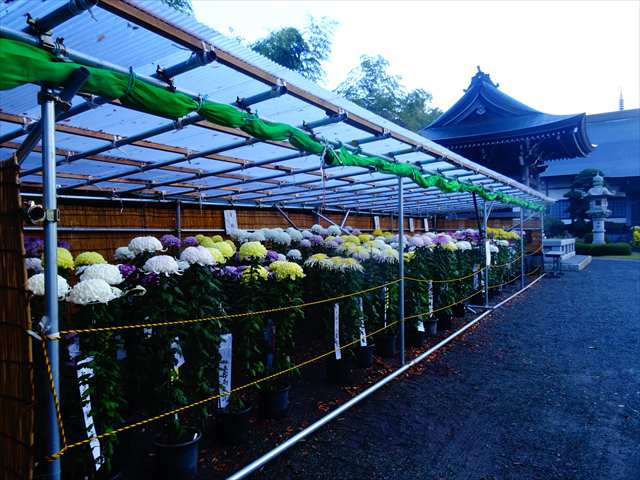 昨日は早朝に地元の寺で開かれている菊花展を見学に行ってきました。早朝のため、見学者はなく境内で開かれている菊花展を独り占め。 白、黄色、紫の厚物(あつもの)。花弁が鱗(うろこ)状に 、幾重にも重なって咲く種類。 丸く立派に盛り上がった白色の厚物。こちらは黄色。花弁が、花頂に向かって整然と半球状に咲いています。こちらは管物(くだもの)。花弁の全てが中空の管状になって放射状に拡がっているもの。 紫。中心が濃く花弁が放射状に拡がっています。 黄色も鮮やか細管(ほそくだ)咲き。 紫の大菊五本仕立ても。 こちらは福助作り。五号鉢を使用し、鉢底から花首までの高さが40cm以下に育てる大輪一本仕立てのもの。茎葉が大きく花を咲かせる姿が福助人形に似ていることからこの名がつけられました。ややピンぼけでしたが。正面から。風よけの為に緑の保護カーテンも設置されていました。 梵鐘の手前に設営された菊花展。 本堂を正面から。本堂の手前の階段の両脇にも展示されていました。 スプレー菊。 球状の可愛い黄色の菊が纏まって咲いていました。 山菊とも呼ばれる小輪の菊。 濃いピンク。 こちらも鮮やかな黄色の小菊。 斜め後ろから。100鉢以上はあるでしょうか。 そして境内の歴史を感じさせる石仏。 赤い帽子を被った石地蔵尊が行儀良く列んで見送ってくれました。 山門正面から。 寺の名は『曹洞宗 光輝山 雲昌禅寺』 。『光輝山』 と白字で書かれた扁額。そして『不許葷酒入山門』 の刻まれた石碑が。『くんしゅ さんもんに いるを ゆるさず』。くさいにおいのする野菜と、酒は、修行の妨げになるので、寺の中に持ち込んではならない、ということ。 この寺の歴史についてネットで調べてみると下記のごとき説明が。『相摸國風土記稿によれば当山は、建保年間(1213年~1219年)に鎌倉幕府二代執権 北条義時が唐より帰朝後、藤沢今田村の地に建立した瑞龍寺を起源とします。慶長元年(1596年)7月水害で罹災した後、鎌倉市植木の龍宝寺四世玖山宗順和尚を開山に迎え、現在地に移り寺号を曹洞宗光輝山雲昌寺と改めました。関東大震災で倒壊した後に、再建した本堂を昭和61年に増改築し、現在に至っています。』 私も以前からこの菊造りを近所の方から進められていますが、通年の繊細な菊造り作業であり私には向いていない?と思いますので・・・・・・。 そしてこの雲昌寺では御朱印を頂けるのでしょうか?