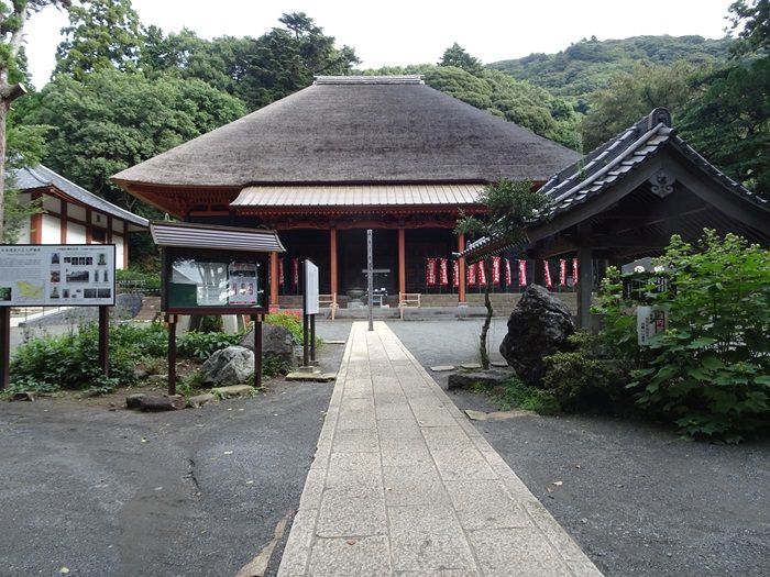 階段を上り終えて日向薬師(ひなたやくし)境内に到着。日向薬師の本尊は薬師三尊。現在の宗派は高野山真言宗。ウィキペディアによると、柴折薬師(高知県大豊町)・米山薬師(新潟県上越市)とともに「日本三薬師」に数えられることもあるとのこと。およそ350年ぶりとなった数年越しの大修理により、平成28年(2016)の秋に装いを新たにしたばかり。かつては日向山霊山寺(ひなたさんりょうぜんじ)と称し、子院12坊を擁する大寺院であったが、廃仏毀釈で多くの堂舎が失われ、現在は霊山寺の別当坊であった宝城坊(ほうじょうぼう)が寺籍を継いでいるのだと。寺号は廃仏毀釈以前は「霊山寺」、以後は「宝城坊」と称するが、中世以来薬師如来の霊場として信仰を集めていることから、「日向薬師」(ひなたやくし)の名で親しまれているとのこと。「宝城坊本堂」説明板。「宝城坊本堂」の名称で国の重要文化財に指定されている。日向山霊山寺の本堂を、同寺の別当房である宝城坊が引き継いだもの。数度にわたり改修されているが、万治3年(1660年)に幕府から寄進された丹沢の立木百本および前本堂の古材を使って修造されたのが現存のこの本堂。寄棟造、茅葺。桁行7間、梁間5間(「間」は長さの単位ではなく、柱間の数を意味する)。梁間の手前2間分を土間の外陣、奥の3間分を内陣とする構造。柱、梁などには前身堂のものと思われる古材が再利用されていると。老朽化と虫害のため、2011年1月より5年以上を掛けて本堂の大修理が行われたのだと。大修理が行われるのは、350年振りにして3回目であったと。『日本遺産のまち伊勢原』案内板。手水舎にてお浄め。冷たい湧き水が。湧き水もご馳走になりました。『史跡 宝城坊境内』説明板。主な文化財は、本堂、鐘楼、仏像、二本杉、大太鼓、寺林と。「宝城坊本堂」を正面から。子育地蔵菩薩像。子育地蔵菩薩像は三家族の奉納の像である事が石碑に刻まれていた。。かなり歴史を感じさせる石塔。基礎部分は関西形式の宝篋印塔(ほうきょういんとう)風であり傘は宝塔(ほうとう)風になっている。色々な様式を取り混ぜており江戸時代以降のものだろうか。隣りの新しそうな宝篋印塔がむしろ初期の(鎌倉時代後期の)関東形式をよく再現しているのだと。石仏群にも生花が手向けられていた。宝殿。宝殿に安置されている仏像~(国重要文化財)◎木造薬師如来坐像◎木造薬師如来両脇士像◎木造日光・月光菩薩像◎木造十二神将立像 ◎木造阿弥陀如来坐像いずれも鎌倉時代の作と。宝殿の前の社務所に壁には『道灌まつり』のポスターが。開催日時:平成30年10月13日(土曜日)・14日(日曜日)。江戸城築城で知られ、伊勢原でその生涯を閉じた戦国の武将・太田道灌にちなんだお祭りで、太田道灌公鷹狩り行列、北条政子日向薬師参詣行列、観光総おどりなどが行われる市内最大のイベントであると。この時期は、残念ながらカンボジア・アンコールワットを旅行の予定。日向薬師の『神木(しぎ)のぼり』のポスターも。高さ5m余りの山に見立てた椎の木に登り、家内安全、無病息災などを祈るための儀式であると。修験者の一人がご神木に登って「表白文」と呼ばれる文書を読み上げるのだと。それ後いよいよ護摩木の山に火がつけられると。護摩壇の蝋燭から松明へ火を移し、それで護摩木に火をつけるとすぐに炎が勢いを増すと。そこにこの日の参詣者が願い事を記した護摩札が修験者の手によって次々に投げ入れられる。傍らでは若い僧侶が般若心経の読経、仏説摩訶般若波羅蜜多心経 観自在菩薩行深般若波羅蜜多時・・・・・・・・・・・。火が収まってきたら今度は火渡りの開始。まず修験者が裸足で渡った後一般開放されるのだと。鳥獣供養碑。『かながわ景勝100選 日向薬師』と刻まれた石碑。南無大師遍照金剛と書かれた幟の奥に。弘法大師(空海)像。相模歌碑。『指して来し 日向の山を 頼む身は 目も明らかに 見えざらめやは』。調べてみると、この『相模』とは地名ではなく、平安時代後期の女性歌人の名であり中古三十六歌仙、女房三十六歌仙の一人。相模守であった大江公資(きみより)の妻であり恋多き女性?であったようだ。眼病を患って薬師堂に籠もり祈願をした時に歌ったものとのことで回復の願いを込めている歌であると。よほど重症だったのであろうか。それとも自らの恋多き行く末が見えないとも歌っているのであろうか??虚空蔵菩薩。樹のうろの中に納められている。元は日向山へ向かう急な山道(現在は通行止)の途中にある奥之院に納められていたのだと。虚空蔵菩薩の真言宗系の真言が書かれていた。『のうぼう あきゃしゃきゃらばや おんありきゃ まりぼり そわか』の御真言が。いくつかの歌碑。『花吹雪 茅葺そめて・・・・』『衝かれるゝ 真言ひとつ・・・・』『此の杉の・・・・・』宝城坊の鐘堂。茅葺は平成24年(2012)に葺き替えられている。鐘堂には宝暦13年(1763)の棟札が確認されているのだと。銅鐘は、銘文によると、天暦六年(952)に村上天