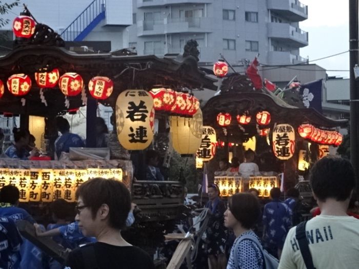 諏訪神社下社への道半ばで行列は一時停止し、しばしはお囃子の共演。山車の後ろ側には対で「若連(わかれん)」と書かれた提灯が。封鎖されて歩行者天国になった道路。 山車の近くで、宵を飾る色とりどりの提灯そして 空気も踊らせる和の音楽を二人で楽しんだのです。山車が一列に。薄暗くなってきて、提灯の明かりがいい感じになって来たのです。そして先頭の山車から、この祭りの見ものの、山車を勢いよく回転させる「ぶん回し」が始まったのです。撮影場所を移動。数人の若者が山車を掴んで回転させます。公園の遊具のように良く回転したのです。そして回転の連鎖が後方の山車に伝わっていったのです。そして急にぶん回しが停まったのです。すると後方から、藤沢行きのバスが通過したのでした。バスが通過した後は再びぶん回しが再開。回転させている若者が離れても、山車はいつまでも回転を続けていたのです。暗さも増し、灯りの輝きが美しく。そして今度は下り線の江ノ島行きの路線バスが。「ぶん回し」を大いに楽しんだ後は、山車を追い抜き諏訪神社下社の境内に向かう。「湘南夜間救急動物病院」と書かれた動物病院が。動物にも夜間救急病院があることを初めて知ったのです。諏訪神社例大祭の警察本部。そして諏訪神社の入口に到着。諏訪大明神の幟も。ウィキペディアによると『創建は養老7年(723年)。信濃国の諏訪大社を勧請しており、他郷へ御分霊した中で最古のものであるとされる。下社は弘仁3年(812年)に宮畑の地より鯨骨の湖畔に移転、上社は天長3年(826年)に諏訪ケ谷より浪合の山腹に移転している。1873年(明治6年)には、村社に列せられた。下社の社殿は1941年(昭和16年)に改築されたもので、同時に社務所も新築されている。また、上社における一間社流造の社殿は昭和天皇御在位六十年奉祝事業として完成したものである』と。境内には多くの出店屋台が出ており、子供達で賑わっていた。懐かしき数々のお面が。諏訪神社の一ノ鳥居。祭神は建御名方命(たけみなかたのみこと)と八坂刀売命(やさかとめのみこと)。魚釣り。諏訪神社の仮設社殿は神輿の到着を待っていた。社殿に向かう参道の先には二ノ鳥居が。金魚すくい。諏訪神社社殿にはお参りの方々の長い列が。前方に前方に茅の輪くりも見えた。茅の輪をくぐることで禊(みそぎ)をして邪悪な穢れ(けがれ)を祓い(はらい)、災難を予防する為のもの。仮設社殿の神輿台。山車が境内に入ってくるにはまだまだ時間があるので、引き揚げることに。467号線を渡り諏訪神社を振り返る。そして帰路は、湘南海岸公園前駅から江ノ電に乗り、藤沢駅で小田急線の乗り換え帰宅したのであった。神輿(みこし)を中心とした祭りは全国各地に多いが、神輿とは神様を社から神輿にお乗せして、村の中を渡り歩いていただくという意味があるのだと。そして、最後には神様を神社にお送りし、御魂をお戻しし、帰っていただくのだと。以下は、ネット情報から。『辞書を引くと、「まつり」には四つほどの文字が当てられているのです。一つは「祀」。これは神に祈り、一定の場所に安置すること。それから神の御霊を慰める「祭」。そして「奉」。神に献上し、召し上がっていただくこと。最後は「政」。政治を行うこと。そこに共通するのは、神と出会うことなのです。そのために祭りをやるのです。だから、神輿を担ぐ若者や壮年の人たち、団扇を打ち振ってそれを煽り立てる年長者、お囃子を奏する人、神楽を舞う人は、その時は神に近づき、自身が神になるのです。また、祭りは集団で行います。人間は共同体を構成するとき、その中心となるもの、人々に共通する精神の核となるものを必要とするのです。それが神で、共同体の人々は、自分たちは同じ神と共にあるという感覚を共有するために祭りを行うのです。』そして最近の祭りは地域起こしや観光の側面を強くしていると感じるのです。しかし、この日の祭りを実際に見ると、神に出会うという祭りの本質は失われていないのでは。それどころか、若い人たちもどんどん祭りに加わって来て、無意識にも祭りの本質を強めているように感じるのです。これはたいへん心強い事。いつまでも日本人の根底にある「祭り」に対する価値観を大切にして欲しいのです。少子化・高齢化が著しいスピードで進むわが国の今後を見据えたとき、30年後、50年後に、果たしてどのくらいの祭りを残すことができるのか、残っているのかに想いを馳せる古希間近の年金生活者なのです。 ・・・その1に戻る・・・ ・・・完・・・