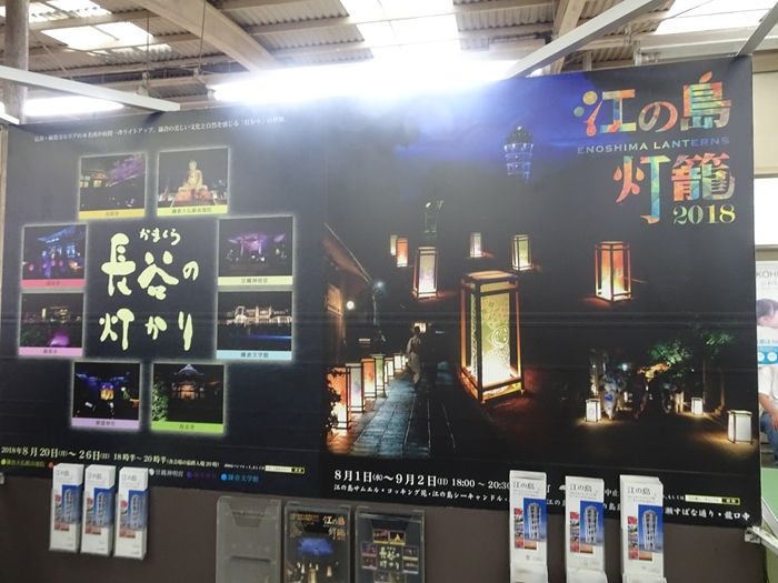 『鎌倉散策 目次』👈リンク「命にかかわる危険な暑さ」という言葉を毎日のように耳にした7月末そして8月も終わり今日から9月、しかし暑さはさほど変わっていないのではと。先日に、これもNHKのニュースで鎌倉の長谷、極楽寺周辺で「かまくら 長谷の灯かり」が開催されていることを知り、翌日の26日までとのことで、行こうと則決断しその旨を旅友グループの「LINE」に書き込みました。するとクイックレスポンスで、いつもの旅友Sさんそして横浜にお住まいのUさんが参加されるとの書き込みが。17時過ぎに自宅を出て、江ノ電・藤沢駅に到着。ホームの壁には「かまくら 長谷の灯り」のポスターが。そしてその隣には「江の島 灯籠 2018」のポスターも。長谷・極楽寺エリアの8名所が夜間一斉ライトアップと。鎌倉の美しい文化と自然を感じる「灯かり」の世界。『かまくら長谷の灯かり』が、8月20日(月)~26日(日)開催されていたのです。長谷・極楽寺界隈の寺社、施設を会場にした光による演出やお参りと併せて体感できるイベント。時間は、18時半から20時半までですが、各会場の最終入場は20時までとのこと。江ノ電・藤沢駅で旅友のSさんと17:45前に合流。利用した江ノ電電車が4両編成で藤沢駅ホームに。そして目的駅の極楽寺駅に向けて出発。海岸線に出て窓から振り返ると、江の島の姿が。遠く雲の上に富士山の頂上、右側の裾野も姿を現してくれました。この日の相模湾は、未だに荒れ模様であった。電灯が灯ってはいるものの未だ未だ明るい極楽寺駅に到着。時間は18:15。「極楽寺駅」にフォーカスしたつもりでしたが、何故か赤いポストに。しかし怪我の功名?何故か?旨く明るく撮れていました。ここで久しぶりのUさんと合流。寺への入場は18:30からとのことで、暫し江ノ電の撮影スポットの桜橋の上で待つ。極楽寺駅から坂を登った突き当りがこの桜橋で、下に極楽寺トンネルが見えるのです。極楽寺トンネルは沿線唯一のトンネルで全長209mと予想外に長いのです。トンネルから出てくる電車を撮影しましたが、今度は暗すぎて・・・。「かまくら 長谷の灯かり」の会場MAPをパンフレットから。夜間一斉ライトアップされる場所は高徳院、光則寺、極楽寺、収玄寺、長谷寺、甘縄神明宮、御霊神社、鎌倉文学館の8箇所。18:30前には既に極楽寺・山門の前には行列が。山号の霊鷲山(りょうじゅさん)と書かれた扁額。山門の手前には、無料貸し出ししてもらえる提灯がテーブル上に並んでいた。この後、入場した先でも散策用の提灯を無料で配布してくれたのです。足元の灯かりになるだけでなく、他の人が持っているのも美しく幻想的で目を楽しませてくれたのです。何と、提灯のLEDライトは、無線データ通信で刻々と色が変わるハイテク提灯だったのです。併せて境内等の提灯も同期して色が変わったのです。「持ち帰っても光りません。お持ち帰りにならないように」と。極楽寺は詳名は「霊鷲山感応院極楽律寺」。本尊は釈迦如来。開基(創立者)は北条重時、開山は忍性であると。鎌倉市の西部、鎌倉七口の1つである極楽寺坂切通の近くにある、鎌倉では珍しい真言律宗の寺院である。僧忍性が実質的な開祖である。中世には子院49箇院を有する大寺院であったと。山門脇の潜り戸から境内に。この時の拝観料が無料である事が嬉しいのであった。参道の両脇には、演出テーマである「茅葺きの山門をくぐり抜けると広がる、蓮の花が浮かぶ極楽浄土をイメージした灯り」が、未だ暮れきってはいなかったがオレンジとピンクの光が並んでいた。透明のアクリルの筒の中に入ったものも。アクリルの筒にも映り込み、やわらかな灯りと対になって。幻想的な蓮の灯かり。百日紅の古木もライトアップされていた。蓮の花の形も微妙に異なって。本堂前にはお参りの列が。「うちわで日本画」のワークショップ会場も。料金1500円で自分だけのうちわが作れるのだと。参道もかなり暗くなり灯かりが鮮やかに輝き始めた。幻想的な世界を楽しむ。参道の脇の灯かりを再び帰路にも。そして極楽寺坂切通を歩き、次の灯かりの場所:御霊神社へ向かう。御霊神社手前の、この踏切からの「トンネル+江ノ電+アジサイ」も人気の撮影スポット。踏切を渡り、ライトアップされた御霊神社を鳥居越しに。境内隅では鎌倉囃子?の生演奏も行われていた。境内には細長の竹をイメージした灯かりが並べられ、オレンジ色に。お祭りの賑わいを表現していると。灯りをズームで。どなたかの脚が映ってしまいましたが悪しからず。境内に古木もライトアップされて。今度は赤く。階段前から刻々と色合いを変える本堂の姿を、人が写らないようにと。紫に輝く本堂。青く。ピンク?に。色の変化を楽しみ、シャッターを押す。そして1段下の階段から、再び青く輝く。灯りを接写。これぞ「灯かり」。それにしても日本語には「灯かり」を表現する言葉の多いこと。『灯し火 ・ 洋灯 ・ 燭 ・ ラムプ ・ 電灯 ・ 明り ・ とぼし ・ ともし火