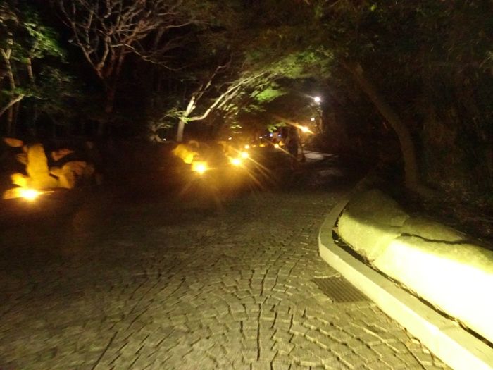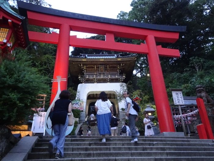 亀ヶ岡広場の灯籠。奥津宮へと歩を進める。江の島シーキャンドル。しばし振り返って、ライトアップの色の変化を楽しむ。江の島サムエル・コッキング苑を過ぎると人の数もやや少なくなって。更に先に進むと山二つと呼ばれる景勝地に出た。これは東西の山の接点となっている箇所であり、南側の「長磯」と名付けられた隆起海食台にいつも圧倒されるのです。明りが灯された灯篭には江の島に伝わる天女や五頭龍が浮かび上がる。江の島シーキャンドルの姿も暗くなるにつれて鮮やかに。奥津宮に向かって進む。奥津宮の鳥居が前方に見えて来た。奥津宮入口の石鳥居は、源頼朝寄進と伝えられている。『吾妻鏡』によれば、源頼朝は、1182年(養和2年)に藤原秀衡調伏のため、江の島の岩屋に弁財天を勧請し、鳥居を寄進した。現在の鳥居は、2004年(平成16年)の台風で破損した後に補修されたもの。前方に奥津宮社殿が。奥津宮は宮が3つある江島神社の中で、一番上の姉神にあたり、海を守る神様として信仰されています。龍神エネルギーが得られる江の島のパワースポットとして人気があるのだと。社殿の先に見えるのが本殿なのですが写っていません。石灯籠も緑に輝く。竜宮大神。江の島で最も龍神エネルギーを得られるパワースポットなのだと。狛犬。そして更に歩を進めると階段の途中にあるのが見晴亭。稚児ヶ淵に降りる石段の途中にあり、釣り人にも人気がある食事処。稚児ヶ淵は、幅50mにわたって隆起した海食台地。大島、伊豆半島、富士山が一望でき、神奈川景勝50選の一つ。稚児ケ淵の入り口あたりにある6つの石碑。反対側から。かつてここには龍燈の松といわれた名物の松があり、江戸時代は観光のポイントであったと。石碑は八雲庵碑、松尾芭蕉句碑、佐羽淡齊詩文碑、服部南郭詩碑、龍燈松碑。稚児ヶ淵は昼間は平らな岩場がひろがる開放的な海岸。しかし,伝説では,鎌倉相承院の稚児白菊が投身自殺したところとか。海はかなり高波が岩場に押し寄せていた。江の島の最西端にある岩場である「稚児ヶ淵」は、下まで降りていくことができる為、夏の昼間は海辺に広がる岩畳で磯遊びや日光浴をしている人が多く見られるのです。妻の幼なじみが建設担当したというトイレを利用。そして再び階段を上り、江の島サムエルコッキング苑を目指す。江の島シーキャンドルの姿が再び前方に。灯籠も更に鮮やかに。右手に『江の島大師』が。江の島大師は、室町時代より代々修験行者家系の第18代目相承者である傳燈大阿闍梨・大僧正 池口惠觀法主の開山になる最福寺の関東別院として、平成5年に開山された真言宗のお寺。御本尊は不動明王で、本堂には、室内にある像としては国内最大6mの赤不動が安置されています。入口にある真っ赤な仁王像・阿形像。仁王像・吽形像。入口にはその他いろいろな像が。 ・・・その2に戻る・・・ ・・・つづく・・・
