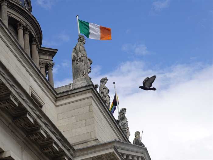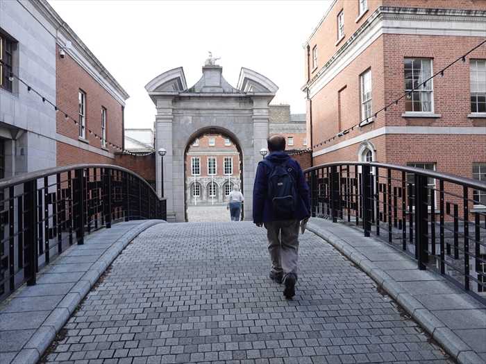 Christ Church Cathedral・クライストチャーチ大聖堂を後にして、東方向に歩く。ダブリン城(Dublin Castle) の敷地内、アッパー・ヤード(Upper Yard) の入り口にある石造りの門が現れた。ダブリン城は13世紀初頭(1204年頃)、イングランド王ジョンの命で建設が始まった。城は防衛拠点として機能するため、四方に高い石壁と堀(moat)が巡らされていた。この堀は、ポドル川(River Poddle)の流れを取り込み、水堀(水のある堀)として利用されていた。実際、ポドル川は現在も地下を流れており、城の下を通過しているのだ と。この太鼓橋の下は現在埋め立てられているが、元々は堀や防衛溝が存在していた空間である と。ダブリン城(Dublin Castle)内の中庭(Upper Yard)に入る石造アーチ門と橋.石造アーチ門は、Upper Yard(アッパー・ヤード)と呼ばれる中庭への主要な出入口の1つ。ダブリン城(Dublin Castle)の配置案内図。近づいて。1 Dublin Castle Ticket Office チケット売場(入口案内所)2 State Apartments 国家行事用の部屋群(一般見学可)3 Viking & Medieval Excavation ヴァイキングと中世遺構の展示エリア4 Chapel Royal 礼拝堂(歴代総督の使用)5 Record Tower 城で最も古い塔(13世紀)6 Dubh Linn Garden 城裏手の公園エリア7 Coach House Gallery アートギャラリー(展示あり)8 Terrace Café カフェスペース9 Hibernia Conference Centre ハイバーニア会議センター (会議や公式イベントに使用される施設)10 Bedford Hall ベッドフォード・ホール (かつてのバンケット会場、現在も多目的に使用)11 Printworks Conference Centre プリントワークス会議センター (大規模イベントや展示会、会議等に対応)12 Chester Beatty チェスター・ビーティ図書館・美術館 (貴重な写本・東西の美術コレクションを所蔵)13 Revenue Museum 税務博物館(Revenue Museum) (アイルランドの税制の歴史を紹介)14 Revenue Commissioners 税務当局(国税庁本部の一部) (事務所棟)15 Assay Office 貴金属検査局(アッセイ・オフィス) (金・銀などの純度を検査・認定)16 Garda Museum ガルダ博物館(警察博物館) (アイルランド警察の歴史・資料を展示)ダブリン城(Dublin Castle)内の「アッパー・ヤード(Upper Yard)」と呼ばれる中庭の様子。写真に見えるのは 「アーチ門(Main Archway)」の内側から見た建物中庭を囲むこの一連の建物群は、18世紀以降に整備されたジョージ王朝様式の公共建築であり、左側の建物は旧軍事用途、右側の建物はかつての「副王(Lord Lieutenant)」の公邸や政庁部門であった。「アーチ門」と「八角形の時計塔付き建物・Bedford Tower(ベッドフォード・タワー)」。 ダブリン城(Dublin Castle)内の「アーチ門(Main Gate/Civic Sword Gate)」を北側(中庭側)から南方向に見る。この門は、Upper Yard(アッパー・ヤード)と外部をつなぐ主門であり、通常「Main Gate」または「Civic Sword Gate」と呼ばれている と。頂上には剣を掲げた人物像が立っていた。通称:「Civic Sword」像。この像は、明確な歴史的人物ではなく、市民権・統治権の象徴(Civic Authority)としての擬人像と考えられている と。主に以下の特徴があるのだと:右手に掲げた長い剣(または槍):「市民の権利と統治の正当性」を象徴(剣に見えるが、 直線的な棒状で槍とも解釈可能)軍装風の服装: 古代ローマ風の軍装スタイル(市民の守護者、都市の防衛)足元のライオンの頭: 「勇気」「権威」「支配力」の象徴。しばしば国家や権力の 象徴として用いられる頭部の羽根付き兜: 戦士・防衛者の姿を表す(ローマ兵のヘルメット風)設置場所: 旧城門の上、通行者の頭上に立ち、都市と城の「守護者」を 象徴する役割ダブリン城(Dublin Castle)の中心的構造物のひとつ、「Bedford Tower(ベッドフォード塔/ベッドフォード・タワー)」。建設時期: 1750年代(ジョージアン時代)建築様式: ジョージアン様式+ロココ的装飾を一部含む構造: 八角形の塔身に銅葺きのドーム屋根(緑青により緑色)役割: 18世紀当初:城の兵器庫(Armoury)の一部 現在は儀礼的シンボル塔として保存・公開時計: 東西南北四方に時計文字盤を配置、視認性を高めている ・右手前(白い三角破風の建物): State Apartments(ステート・アパートメンツ)の入口がある建物。 かつては貴族や賓客を迎えるレセプション・エリアとして使用された。現在は博物館施設。・右側中央(国旗の掲揚): ガバメント棟(Government Buildings)一部。 国旗(アイルランド三色旗)が掲げられており、迎賓施設の一部でもある。・左奥に伸びる建物 :19世紀以降に再建・改修された行政系建物。同一様式のアーケードが続くことから、 ジョージアン建築の統一感が見られる。・背後に見える塔状の建物: Bedford Tower(時計塔)の一部がクレーンの左下に少しだけ写っていた。こちらは「パレス・ストリート門(Palace Street Gate)」この門は「Palace Street Gate」で、ダブリン城の北東側に位置し、現在のシティ・ホール(Dublin City Hall)近く。門の上には、「正義の女神(Lady Justice)」の像が立っていた。上部には、天秤と剣を持った「正義の女神(Lady Justice)」の像が載っており、西洋では裁判・法・秩序の象徴。他の門と異なり、この女神像は目隠しをしていない(blindfoldなし)点が特