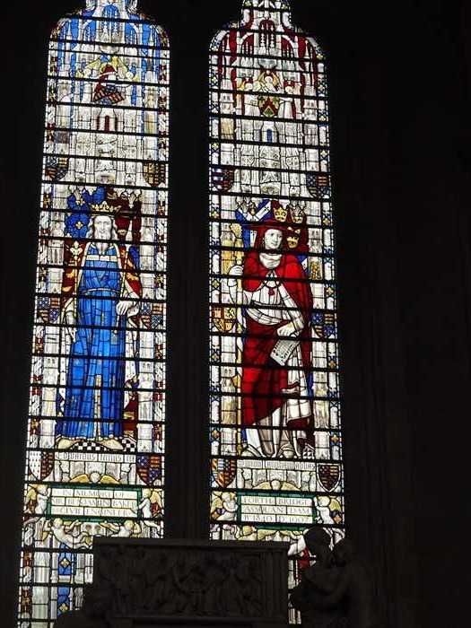 さらにWestminster Abbeyのステンドグラスをカメラで追う。・左側の人物(青衣・冠) ・王冠をかぶり、青いマントを纏った王の姿。 ・伝統的に「聖王エドワード懺悔王(Edward the Confessor)」として描かれることが多い姿。 ・ウェストミンスター寺院はエドワード懺悔王が創建した修道院を前身とするため、彼の像や 窓は特に強調されています。・右側の人物(赤衣・冠) ・王冠と赤いマント、手に巻物(法や統治を象徴)。 ・「ヘンリー3世(Henry III)」を描いている可能性が高いです。 ・ヘンリー3世はウェストミンスター寺院の再建(13世紀ゴシック様式への改築)を行った王で、 エドワード懺悔王の聖性を顕彰しました。ステンドグラス最下段にラテン語の銘文が帯状にあり、左窓には「EDWARDUS CONFESSOR REX」。右窓には「HENRICUS TERTIUS REX」 などと王名が記されていた。人物をズーム。再びウェストミンスター寺院(Westminster Abbey)の内陣(Sanctuary)とクワイア(Choir)方向 を。・ゴシック様式の高いリブ・ヴォールト天井 縦方向の高さを強調する垂直線が続き、イングランド・ゴシックの典型的なスタイル。・左右に並ぶ巨大なパイプオルガン 精緻な装飾が施されたオルガンは、合唱隊席(Choir Stalls)の上部に設置。・手前の金色の装飾スクリーン(Rood Screen / Choir Screen) ゴシック・リヴァイヴァル様式で復元された荘厳なスクリーンで、聖域と参拝者の場を区切る 役割を果たす。左側:アハズ王 (King Ahaz)・赤いマント、王冠、笏を持つ。・旧約聖書『列王記』などに登場、ユダ王国の王。偶像崇拝の傾向が強く「不信仰な王」として 描かれる。右側:ヒゼキヤ王 (King Hezekiah)・青いマント、王冠、笏を持つ。・ユダ王国の王で、宗教改革を行い偶像を排し、神への信仰を回復させた「善王」として知られる。人物をズームして。このステンドグラスは 旧約聖書に登場するユダ王国の王 を描いた窓であり、左:アハズ王(King Ahaz) ― 在位16年右:ヒゼキヤ王(King Hezekiah) ― 在位29年左側:ヨシャパテ王 (King Jehoshaphat)・青いローブ、王冠と笏を持つ。・南ユダ王国4代目の王で、在位25年(列王記上22章・歴代誌下)。宗教的改革を進め、 神殿礼拝を強調した。右側:ヨラム王 (King Jehoram)・赤いローブ、王冠を戴く。・ヨシャパテの子、ユダ王国の5代目の王。在位8年。バアル崇拝を導入し「悪王」として描かれる。人物をズームして。このステンドグラスは 旧約聖書のユダ王国の王 を描いており、・左:ヨシャパテ王(King Jehoshaphat) ― 在位25年・右:ヨラム王(King Jehoram) ― 在位8年さらにユダ王国の歴代の王を並べたステンドグラスが続いていたのであった。左側:アハズ王 (King Ahaz)・赤衣、王冠と笏を持つ。・南ユダ王国12代の王。在位16年(列王記下16章・歴代誌下28章)。 偶像崇拝を行い「悪王」とされた。右側:ヒゼキヤ王 (King Hezekiah)・青衣、笏と巻物(律法書?)を手にする。・アハズの子でユダ王国13代の王。在位29年(列王記下18章・歴代誌下29章)。 宗教改革を行い、アッシリア侵攻の危機に信仰をもって立ち向かった「善王」。このステンドグラスは「親子二代のユダ王」を描いていた。左:マナセ王(King Manasseh)・白い衣に赤マント、王冠を戴く。・ヒゼキヤ王の子でユダ王国14代の王。最長の55年間在位。偶像崇拝を強め、歴代の中でも 最悪の王とされるが、晩年に悔い改めたと伝えられる。右:アモン王(King Amon)・青衣に王冠。マナセの子で15代の王。・在位はわずか2年で暗殺され、その子ヨシヤに王位が継承された。以上、これらのステンドグラス配置の特徴は・各窓は左右2名の王を一対で描写・下部に ラテン語・英語銘文 で「KING XXX REIGNED YY YEARS」と刻まれている・王冠を戴き、色分けされた衣装(赤=偶像崇拝傾向の王、青=信仰的な王)という対比の意匠が 見られるのであった。再び、ウェストミンスター寺院(Westminster Abbey)身廊(Nave)の西端方向を見る。・身廊西端(West End) に巨大な二層の窓があり、そこに「ユダ王国の王たち( Kings of Judah)」が縦列で並んでいた。・各窓は 上下二段構成 × 左右ペア で、一対ごとに2名の王が描かれる形式。・合計で 10対(20名程度)が描かれていた。・実際の歴代ユダ王は20人(ソロモン以降〜ゼデキヤまで)なので、全王が網羅されている シリーズ と。このステンドグラスは、ウェストミンスター寺院の身廊西端・大窓の下段にあるステンドグラスの一部 で、今まで見てきた「ユダ王国の王シリーズ」とは異なり、旧約〜新約の物語場面(主に神殿に関する場面)を描いた物語窓。左側(左ランセット)最下段・「SOLOMON DEDICATES THE TEMPLE」・ソロモン王が神殿を奉献する場面。香炉・祭壇と共に祈る姿。中段・「HEZEKIAH SHOWS THE TREASURES TO ENVOYS」・ヒゼキヤ王がバビロンの使者に宝物を見せる場面。上段・「JOSIAH READS THE BOOK OF THE LAW」・ヨシヤ王が律法の書を民に読み聞かせる場面。宗教改革を象徴。右側(右ランセット)最下段・「JESUS IN THE TEMPLE」・少年イエスが神殿で教師たちと議論する場面(ルカ2章)。中段・「PURIFICATION OF THE TEMPLE」・イエスが神殿から商人を追い