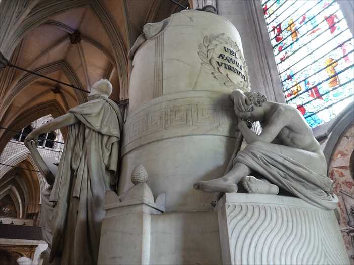 Westminster Abbeyの堂内に入る。案内図。①The north transept 北翼廊(聖堂の横断部、北側の翼)②The choir 聖歌隊席(クワイア)/聖歌隊席部分 ③The sanctuary 内陣(祭壇周辺の聖域)④The Chapel of St. Edward 聖エドワード礼拝堂⑤The Lady Chapel 聖母マリア礼拝堂(通称:レディ・チャペル)⑥The south transept 南翼廊(聖堂の横断部、南側の翼)⑦The main nave 中央身廊(大身廊)⑧The cloisters 回廊(クロイスター)⑨The Chapter House 参事会室(チャプター・ハウス)⑩The Pyx Chamber ピクス室(Pyx=聖体容器を保管する部屋)入口直後の北の翼廊にあったのが、ウィリアム・マーレイ(初代マンスフィールド伯, William Murray, 1705–1793) の記念碑。1.中央上段・マンスフィールド伯爵本人が裁判官のローブとカツラを身にまとい、裁きの座に座る姿で 表現されています。・威厳ある椅子は円形で、ギリシア風の幾何学文様が施されています。2.両脇の寓意像・左:Justice(正義) — 右手を掲げ、断固とした態度を示す女性像。・右:Wisdom(知恵) — 頭に兜をかぶり、大きな書物を手にする女性像 (アテナ/ミネルヴァ的姿)。3.基壇部・マンスフィールド家の紋章(盾と星、王冠)と、ファスケス(権威の象徴)などが飾られて います。4.背景アーチ下の三像(後方の人物群)・立像①:裁き(Justiceの補助的表現) ・巻物を持つ人物。法と判例の継承を象徴。・立像②:知恵(Wisdom / Eloquence) ・演説や弁論を思わせるポーズ。 ・マンスフィールド伯の弁論能力・雄弁を象徴。・立像③:力または秩序(Fortitude / Authority) ・堅固な姿勢で佇む。 ・秩序の維持と法の強さを象徴。「"Here Murray long enough his country's pride is now no more than Tully or than Hyde".Foretold by Ar. Pope and fulfilled in the year 1793 when William Earl of Mansfield diedfull of years and of honours: of honours he declined many: those which he accepted were the following: he was appointed Solicitor General 1742, Attorney General 1754,Lord Chief Justice and Baron Mansfield 1756, Earl of Mansfield 1776. From the love which he bore to the place of his early education, he desired to be buried in this cathedral (privately) and would have forbidden that instance of human vanity, the erecting a monument to his memory, but a sum which with the interest has amountedto two thousand five hundred pounds was left for that purpose by A.Bailey Esqr. ofLyon's Inn, which at least well meant mark of esteem he had no previous knowledge or suspicion of and had no power to prevent being executed. He was the fourth son of David,fifth Viscount Stormont, and married the Lady Elizabeth Finch, daughter to Daniel, Earl of Nottingham by whom he had no issue. Born at Scone 2nd March 1704. Died at Kenwood 20th March 1793.」 【ここに眠るのは、長らく祖国の誇りであったマーレイ。今や彼もまた、トゥリー(キケロ)やハイドと同じく過去の偉人にすぎない。詩人ポープによって予言され、1793年に成就した。この年、ウィリアム・マンスフィールド伯は、数多の栄誉と長寿の末に没した。彼は多くの栄誉を辞退したが、受けたものは以下の通りである。法務次官(Solicitor General, 1742年)法務長官(Attorney General, 1754年)王国高等法院長官・マンスフィールド男爵(Lord Chief Justice & Baron Mansfield, 1756年)マンスフィールド伯爵(Earl of Mansfield, 1776年)彼は若き日に学んだこの大聖堂への愛情から、人知れずここに埋葬されることを望み、虚栄の証としての記念碑の建立を固く禁じたであろう。しかし、彼の遺志により少なくとも2,500ポンドが遺され、利子を含めて3,500ポンドに達し、これによってこの記念碑はリヨンズ・インのジェームズ・ベイリー氏によって建立された。彼は敬意と尊崇の念からこれを遂行したのであり、遺贈の存在を事前に知っていたわけでも、拒む権限があったわけでもなかった。彼は第5代ストーモント子爵デイヴィッドの四男として生まれ、ノッティンガム伯ダニエルの娘エリザベス・フィンチ夫人と結婚したが、子はなかった。1704年3月2日、スコーンに生まれ、1793年3月20日、ケンウッドにて没した。】裏側に廻って。「沈思の若者像(Melancholy / Meditation)」が半ば隠れる形で配置されていた。大きな円筒形の台座にラテン語「UNI ÆQUUS VIRTUTI」と。「UNI ÆQUUS VIRTUTI」・「ただ一人、徳(美徳)に比肩する者」・直訳すると「徳にのみ比するに値する唯一の人」・意味合いとしては「その人物(マンスフィールド伯)の価値は、美徳に等しいただ一つの存在」 という称賛の表現」 であると。ウェストミンスター寺院の「法曹関係者のコーナー(Lawyers' Corner / North Transept の一角)」 を。・正面奥に見えるのは北翼廊(North Transept)の突き当たり。・写真右手に並んでいるのは法曹関係者(判事・法学者)や政治家の記念碑群。 胸像や立像が壁に沿って配置されていた。・その中に ウィリアム・マーレイ(初代マンスフィールド伯, 1705–1793) の大きな記念碑も 含まれていた。北翼廊(North Transept)の北端正面(北壁)上部のステンドグラス。ズームして。さらに近づいて見上げて。北翼廊突き当たり(北壁)のバラ窓(Rose Window) を正面から。バラ窓(Rose Window)の特徴・位置:ウェストミンスター寺院北翼廊の最上部中央。・様式:放射状に広がるゴシック様式の tracery(石枠)で、中心から花