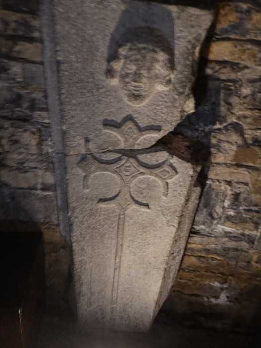 Christ Church Cathedral(クライスト・チャーチ大聖堂)クリプト内に展示されている中世の墓石(tomb slab)の一つ。・形状:頭部側がやや広く、足元側に向かって細くなる典型的な中世の 石棺蓋(grave cover)の形。・彫刻: ・上部中央に顔(おそらく被葬者、または聖職者を示す)。 ・中央に長い茎を持つ装飾的な十字(クロス)文様。四つ葉や花弁に似た意匠は、 14〜15世紀頃のゴシック様式で見られるタイプ。・素材:地元の石灰岩(limestone)と考えられる と。先ほど、案内があった「The Listening Bench」の案内パネル。 「Christ Church Cathedral DublinThe Listening BenchWelcome to the Listening Bench where you can hear a selection of Christ Church Storiesabout the life of the cathedral today and some of the people who are a part of it.Please pick up a handset to hear instructions.This bench is wheelchair accessible and you can listen to the interviews withyour hearing aid via the induction hand-piece.1.Màirin Johnston, local historian and author2.Ellie Kisyombe, founder of Our Table3.Canon Roy Byrne, Precentor4.Cherinet Ayele, musician5.Louisa Santoro, CEO, The Mendicity Institute6.Maureen Reid, Sacristan」 【クライスト・チャーチ大聖堂(ダブリン)リスニング・ベンチようこそ「リスニング・ベンチ」へ。ここでは、クライスト・チャーチ物語の中から、大聖堂の今日の活動や、それに関わる人々についてのセレクションをお聞きいただけます。指示を聞くには、受話器を手に取ってください。このベンチは車椅子で利用可能で、補聴器をお使いの方は誘導用ハンドピースを介してインタビューをお聞きいただけます。1.メーリン・ジョンストン(地元の歴史家・著者)2.エリー・キショムベ(「アワ・テーブル」創設者)3.キャノン・ロイ・バーン(礼拝主任)4.チェリネット・アエル(音楽家)5.ルイーザ・サントロ(メンディシティ・インスティテュートCEO)6.モーリーン・リード(聖具係)】「The Listening Bench」。 操作部。・多言語対応: ・英語(English) ・ドイツ語(Deutsch) ・フランス語(Français) ・スペイン語(Español) ・イタリア語(Italiano) → 上部のボタンで言語を選択できます。・ 操作方法: ・選択ボタンを押すと、その言語で案内音声やインタビューが再生されます。 ・右側のハンドセット(受話器)を持ち上げて耳に当てて聞きます。 ・上部には補聴器用の誘導ループ受信ポイント(白い楕円形部分)もあります。「Treasures of Christ Church」展示コーナーの金メッキ銀器(gilt silver plate)コレクションの一部.廻り込んで。「The 1777 Plate CollectionFollowing the theft of the "1684" plate in 1777, the dean and chapter purchased a new set of communion plate from Messrs Pickett & Rundell, London at a cost of nearly £500 (Irish pounds). It was made by James Young, a London goldsmith and comprised two chalices with matching covers, two patens, an oval alms dish and a pair of candlesticks.The large oval alms dish has a reeded border with bands of fruit, flowers and foliage and the centre panel shows a depiction of the Last Supper. The chalices are highly decorated with the sacred monogram "IHS" and stand on circular feet. The two plates, possibly designed as patens, also bear the sacred monogram "IHS" within a chased sunburst motif.Following the purchase of the plate some of the stolen "1683" plate was recovered. The 1777 plate was used daily until replaced by a set of plate presented by Henry Roe, the whisky distiller who funded the restoration of Christ Church, in 1878. The candlesticks from the 1777 suite remained in use into the 1950s. In 1951, a single candlestick and the large alms dish were given on loan for the Festival of Britain and were held in the Lincoln Usher Art Gallery. They were described by one commentator as being "probably the most beautiful eighteenth-century church silver in the British Isles".」 【1777年の聖餐用銀器コレクション1777年、「1684年製」の聖餐用銀器が盗難に遭った後、学長と参事会はロンドンのPickett & Rundell社から新しい聖餐用銀器セットを購入しました。費用はほぼ500アイリッシュ・ポンドで、製作はロンドンの金細工師ジェームズ・ヤングによるものです。このセットには、蓋付きの聖杯2つ、パテン(パンを置く皿)2枚、楕円形の施し皿1枚、燭台2基が含まれていました。大型楕円形の施し皿は、果物や花、葉の帯状装飾を持つ縁取りがあり、中央パネルには「最後の晩餐」が描かれています。聖杯には「IHS」の聖なるモノグラムが高度に装飾され、円形の台座に立っています。パテンと思われる2枚の皿にも、放射状の光輪模様の中に「IHS」のモノグラムが刻まれています。この購入後、盗まれていた「1683年製」の銀器の一部が回収されました。1777年の銀器は、1878年にクリスト・チャーチ修復の資金を提供したウイスキー蒸留業者ヘンリー・ローから寄贈された銀器セットに置き換えられるまで、日常的に使用されました。1777年セットの燭台は1950年代まで使用され続けました。1951年には、このセットの燭台1基と大型施し皿が「フェスティバル・オブ・ブリテン」に貸し出され、リンカーン・アッシャー美術館に展示されました。ある評論家はこれらを「おそらく英国諸島で最も美しい18世紀の教会用銀器」と評しました。】「The 1684 Plate CollectionIn December 1683, the dean and chapter of Christ Church purchased this set of communio