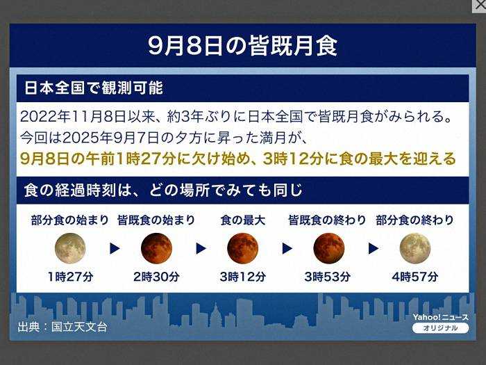 昨日、9月8日(月)早朝に、満月全体が地球の影の中に入り込んで月の表面に太陽光が当たらなくなる「皆既月食」が3年ぶりに観測できたのであった。 今回は前日、2025年9月7日(日)の夕方に昇った満月が、9月8日(月)の午前1時27分に欠け始め、3時12分に食の最大を迎える。そして3時53分に皆既月食が終わり、部分食も4時57分に終了すると。わが町からの皆既月食のタームテーブルをネットから作成。半影食が始まるのは0時27分と。そして食の最大は上記の如く3時12分、皆既食の終りは3時53分、部分食の終りは4時57分、そしてこの日の月の入は5時29分と。上記を絵にした皆既月食の見え方。皆既月食は、太陽からの光によってできた地球の影の中を月が通過するときに見られる現象。 つまり、太陽-地球-月が一直線にならんだ時に見られるものなので、つねに月は満月ということになる。 「上弦の月の月食」とか「三日月の月食」というのは絶対におきない。地球の影には大きく2つの種類がある。 一つは「本影」と呼ばれる影で、太陽からの光が全く届かない部分だ。 本影の部分から見ると、太陽は地球によって完全に隠されてしまっている。もう一つは「半影」と呼ばれる影で、本影の外側に大きく拡がった部分だ。 ここは太陽の光の一部が届く部分で、ここから見ると太陽の一部が地球からはみだして、部分日食の状態に見えるはずだ。地球の軌道と月の軌道は、一致しているわけではないので、月が満月のたびに月食がおきるようなことはない。また、本影と月の経路も一様ではなく、ときには月の一部が本影をかすめたり(部分月食という)、月全体が本影にすっぽりつつまれたり(皆既月食)するのだ。皆既月食になると、月は地球の本影の中に入ってしまうが、完全に暗くなってしまうわけではなく、わずかに赤味をおびて見える。地球の大気の中を太陽光が通過するとき、その光は大気によって曲げられて(屈折して)月まで届き、ほんのりと月を照らします。このとき、光の成分のうち波長の短い青い光は大気に散乱されるためほとんど月まで届きません。一方、波長の長い赤い光は散乱されにくく、月まで届いて月面を照らします。このため、月は真っ暗になることはなく、赤っぽい色に見えるのです。大気中の塵や水蒸気の量によって、非常に濃い茶色や赤色のように見えることもあれば、明るいオレンジ色のように見えることもあるのだと。そして、腕時計のアラームを食の最大となる前の3時にして起床。パジャマのままカメラを持って外に出る。西方向の空には皆既月食の赤い月の姿が。時間は3時12分。そして皆既月食終了直前。時間は3時50分。左斜め上方が少し白くなり始めて来た。東の空には輝く星の姿が。土星の姿であっただろうか?時間は皆既食終了直後の3時55分。左斜め上方がじわじわと白くなり始めて来た。3時58分。ズームして。4時10分。4時16分。4時21分。4時27分。赤さもほとんど無くなって来た。4時40分。月の表面の模様が見えてきました。4時45分。東の空も赤く染まって来た。部分食の終了直前の4時56分。部分食の終了直後の5時00分。周囲の風景の中に。5時2分。大学の高層校舎をズームして。そして5時2分でカメラ撮影を終了。この9月の満月は「コーンムーン」と呼ぶと。 農事暦(The Old Farmer's Almanac)によると、アメリカでは2025年9月の満月を「コーンムーン(Corn Moon/トウモロコシの収穫月)」と呼ぶのだと。今後日本で見られる月食。これから3回は月と日にちが一緒の日。来年のひな祭りの日の皆既月食は18時49分20秒から始まると。最大食に時間は20時33分。寝不足の心配はなさそう。そして2029年1月1日の皆既月食は0時7分からと。そして最大食は1時52分。2028年から2029年に変わる夜、除夜の鐘を聞いた直後に皆既月食が見られるのだと。元旦の早朝から皆既月食が見られるとは!!私もこの時まで頑張ろう!! ・・・おわり・・・