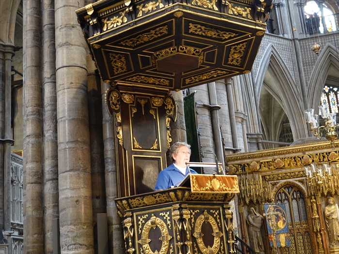 ウェストミンスター寺院(Westminster Abbey)の堂内に設置された説教壇(pulpit, 説教台)。後方に見えている精緻な金の柵は High Altar(高壇祭壇)を囲むスクリーン の一部。近づいて。説教壇(Pulpit)の特徴・用途 礼拝時に聖職者がここに立ち、説教や聖書朗読を行うための壇。・装飾 黒地に金色の細工が施されており、ルネサンス〜バロック風の豪華な装飾が特徴。 周囲にリース状のモチーフや植物文様、金色の縁取りが見られる。・構造 ・上部に「張り出した天蓋(sounding board)」が設置され、声を反響させて聴衆に 届きやすくする役割を果たしている。 ・側面・前面には聖書を置くための台と手すりがあり、下から階段で上る形式。(回廊)に面する窓のステンドグラス。中央パネルを見ると、聖人が槍(または十字の杖)で竜を退治している場面が描かれています。これは伝統的に 聖ゲオルギウス(St. George) として表されることが多い主題。聖ゲオルギウスはイングランドの守護聖人で、「竜を退治する聖人」として有名。右側に赤い竜が大きく描かれており、その足下に聖人が立っています。背後に後光(光輪)を帯びており、聖人としての神聖さを示しています。ヘンリー7世記念礼拝堂(Henry VII’s Lady Chapel) の内部。1.扇形ヴォールト天井(Fan Vaulting) ・天井全体が華麗な扇形ヴォールトで覆われており、これはイギリス後期ゴシック (垂直様式)の最高傑作のひとつ。 ・特に Henry VII Lady Chapel の最大の特徴。2.騎士団旗(Knights’ Banners) ・天井から下がっている色鮮やかな旗は、ガーター騎士団(Order of the Garter) の 騎士の紋章旗。 ・Lady Chapel はガーター騎士団の「礼拝の場」としても使われます。3.ステンドグラス窓 ・正面の大窓はゴシック様式の高窓で、彩色ガラスがはめ込まれている。・天井の構造 ・イギリス後期ゴシック(垂直様式)の最高傑作とされる「扇形ヴォールト (Fan Vaulting)」が全面に広がっています。 ・幾何学的かつレースのように精緻な石細工は、この礼拝堂の最大の特徴。・吊り下げられた旗(バナー) ・両脇に並んでいるのは ガーター騎士団(Order of the Garter)の騎士の紋章旗。 ・ガーター騎士団はイギリス最高位の騎士団で、女王(王)が総長。 ・騎士任命者の旗が礼拝堂に掲げられます。・窓 ・奥に高いステンドグラス窓が見え、光が差し込む構造は Lady Chapel 正面そのもの。「Henry VII’s Lady Chapel(ヘンリー7世記念礼拝堂)」 の一角を見上げて。1.黒い木彫の聖歌隊席(Choir Stalls) ・礼拝堂両脇に並ぶ精巧な木製の聖歌隊席。 ・黒く塗られ、上部には金色の十字が掲げられており、ガーター騎士団の席としても 使われています。 ・この席には、騎士団のメンバーの紋章や名が記録され、椅子の上にヘルメットや紋章飾りが 置かれることもあります。2.頭上に掲げられた旗(バナー) ・騎士団の紋章旗で、ガーター騎士団(Order of the Garter)の騎士それぞれを表しています。 ・各旗にはその騎士の家系や個人の紋章が描かれ、現役騎士の間は掲げられています。3.背後の高窓 ・ゴシック様式の大きなステンドグラス窓が背景に見えます。 ・礼拝堂内は全体的に明るく、天井の扇形ヴォールトと一体となった荘厳な雰囲気を 形作っています。Henry VII’s Lady Chapel(ヘンリー7世記念礼拝堂) の内部、正面側(東端)を再び。1.ステンドグラス窓 ・中央に縦に並んだ大きなステンドグラス(赤や青を基調)が。 ・両脇の窓は青色が強く、中央の窓と色調が異なるのが特徴。2.下部の彫像群 ・窓下には、多数の小像(聖人・王族・天使など)を並べた精緻な彫刻帯があります。 ・礼拝堂内部の最も豪華な装飾部分の一つです。3.ガーター騎士団の旗 ・左右に掲げられている色鮮やかな旗は、ガーター騎士団(Order of the Garter)の 騎士の紋章旗。 ・それぞれの旗が現役騎士を表している。4.天井の扇形ヴォールト ・上部には Henry VII Lady Chapel 特有の「扇形ヴォールト」が広がっていた。中央のHenry VII’s Lady Chapel(ヘンリー7世記念礼拝堂)東端の大ステンドグラス窓をズームして。・ゴシック様式の縦長窓 ・尖頭アーチの内に、縦に細長いパネルが多数並ぶ典型的な後期ゴシック様式。 ・上部はさらに小窓(トレーサリー)に分割されていた。・彩色(赤・青・白を基調) ・赤と青が中心で、人物や場面が描かれていた。 ・上段と下段で異なる場面が配置されているのが見てとれた。Henry VII’s Lady Chapel(ヘンリー7世記念礼拝堂)東端の「大中央窓」の左側窓。・色彩 ・ほぼ一面が「青と白」の抽象的な模様で構成されています。 ・中央の大窓(聖母マリアや聖人が描かれた具象的なステンドグラス)とは対照的で、 こちらはモダンなデザイン。・主題 ・この青い窓は、1940年のロンドン大空襲(The Blitz)で破壊された旧ステンドグラスの 代わりに、戦後に新しく制作されたもの。 ・主題は「空・光・星」といった抽象的なモチーフが中心で、戦後の再生・希望・平和を象徴。Henry VII’s Lady Chapel(ヘンリー7世記念礼拝堂)東端の「大中央窓」の右側窓。聖歌隊席(Choir Stalls) を下から見上げて。