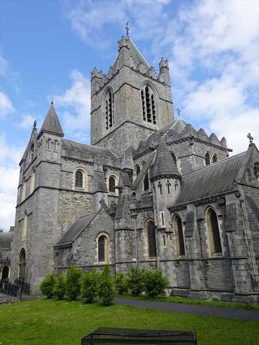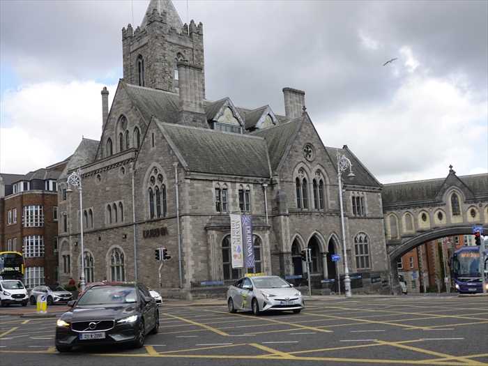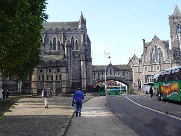 「Christ Church Cathedral(クライストチャーチ大聖堂)」が前方に。・写真左の大きな建物: → クライストチャーチ大聖堂(Christ Church Cathedral)本体。 アイルランド国教会(アングリカン)のダブリン主教座聖堂であり、12世紀にノルマン人に よって建てられたロマネスク様式とゴシック様式が融合した建築。・中央奥のアーチ状の通路: → 通称「シナジー・ブリッジ(Synod Hall Bridge)」。 このアーチ橋は大聖堂と向かいの建物(旧シナジーホール)をつないでおり、博物館展示や 管理施設として使われている建物への連絡通路となっています。・右の建物(やや奥): → 元々はシナジーホール(Synod Hall)で、現在は「Dublinia(ダブリニア)博物館」という バイキングと中世ダブリンの体験型歴史博物館として利用されています。ズームして。Christ Church Cathedral(クライストチャーチ大聖堂) ・創建:1030年頃(ハムダール=ヴァイキング王による) ・改築:1172年頃、ノルマン人指導者ストロングボウ(Richard de Clare)による拡張。 ・特徴:地下納骨堂(クリプト)、ストロングボウの墓、バイキングとノルマンの融合した 建築、合唱席など。Christ Church Cathedral(クライストチャーチ大聖堂) の側面(南側)をズームして。手前中央の突き出た部分をズームして。これは大聖堂本体から突き出した小聖堂(チャペル)または構造上の付属室。特徴は以下の通りと: 特徴 解説アーチ状のドア ロマネスク様式を彷彿とさせる円形アーチの木製扉。三連アーチの開口部 中央部に見られる3つの小アーチは、中世風の窓あるいは装飾的要素。丸窓(円形の開口) 光を取り入れるための開口部で、象徴的な配置。装飾のない壁面 石材の質感がそのまま残され、修道院風の質素な趣を見せています。この突き出た構造はしばしば「アプス(後陣)」や「チャプター・ハウス(参事会室)」などと解釈されることがありますが、クライストチャーチ大聖堂の場合、地下納骨堂(Crypt)や礼拝室に通じる部分とも考えられます と。移動して。Christ Church Cathedral(クライストチャーチ大聖堂) の「西面(West Side)。近づいて「西正面(West Front)」を 。Christ Church Cathedral(クライストチャーチ大聖堂) に隣接する シナーズ通り(Synod Hall / Synod House) と、それをつなぐストーンブリッジ(空中廊下/連絡橋) を西側(Lord Edward Street 方面)から見上げて。ストーンブリッジ(空中廊下/連絡橋)をズームして。さらに、クライストチャーチ大聖堂(Christ Church Cathedral)と、隣接するSynod Hall(現 Dublinia 博物館)とを繋ぐ有名な連絡橋(Sky Bridge / Footbridge)。◆アーチ部分 丸みを帯びたローマンアーチ(ロマネスク様式)で構成。重厚な石造りで、 街道をまたいでいます。◆ 窓(開口部) 小さな円形(オクルス)や狭長の尖塔アーチ窓(ランセット窓)など、 中世風の意匠が並びます。小さなバラ窓のような構成です。◆ 突き出し部 左上部の三角屋根の小尖塔(ペディメント付き)は、橋の頂部装飾です。 装飾性と垂直性を強調しています。◆背後の建物 ネオ・ゴシック様式の建物で、かつて教会会議場だったものを (Synod Hall) 改修し、現在はDublinia(中世・ヴァイキング博物館)として公開されて います。窓や石積みの細部に注目すると、現代的な復古デザインであることが わかります。◆細部の意匠 開口部の周囲には、装飾的な柱頭・小アーチトリミングが施されており、 建築全体に「教会的・修道院的な荘厳さ」を与えています。東側に隣接するSynod Hall(シノッド・ホール)を正面から。現在この建物は、Dublinia(ダブリニア)ヴァイキング&中世博物館として活用されている と。観光案内サインポスト。アイルランド語(Gaeilge)と英語の併記で、主要な観光スポットや文化施設への徒歩ルートが示されていた。Christ Church Cathedral, Dublin(ダブリン・クライストチャーチ大聖堂)を南側から。・創建:約1030年(シトリック・シルケンベアード王による)・様式:ノルマン様式とゴシック様式の融合・管轄:アイルランド国教会(Church of Ireland)・特徴:大規模な地下納骨堂(クリプト)、美しいステンドグラス、ネオゴシック再建(19世紀)・中央奥の高い塔:鐘楼(bell tower)、建物のランドマーク的存在。・左側のファサード:尖頭アーチ窓や控え壁(バットレス)が並ぶ典型的なネオゴシック。・右側の八角塔屋根の部分:聖具室(sacristy)や礼拝室が含まれます。・手前の旗: ・青い旗:EU旗 ・緑白オレンジ:アイルランド国旗 ・虹旗:LGBTQ+フレンドリーな姿勢の表明と思われます。Christ Church Cathedral(クライストチャーチ大聖堂)の鐘楼(bell tower)をズームして。形状:四角形の堅牢な石造り塔。上部には尖塔(スパイア)が載る。屋根:ピラミッド型のスレート屋根。塔の四隅にはミニタレット(小塔)付き。窓:各面に尖頭アーチの2連ランセット窓。鐘音を通すための開口部(ルーバー)付き。装飾:クレネレーション(城のようなギザギザの胸壁)あり。中世の要塞風。上部の十字架:屋根の頂点にはクロス(キリスト教の象徴)が立っている。立体模型(ブロンズ・モデル)。視覚障害者の方にも触って構造を理解してもらう目的で設置