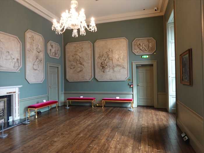さらに、ダブリン城(Dublin Castle)のステート・アパートメント(State Apartments)内の見学を続ける。「Apollo Room(アポロの間)」。・壁面の大きなレリーフ:古代神話(おそらくギリシャ神話、音楽や芸術の神アポロやミューズに 関する場面)が描かれた浅浮彫。・18世紀風の室内装飾:青緑色の壁、白いモールディング(額縁状装飾)、クラシカルな暖炉。・赤いビロード張りベンチと金色の脚:ダブリン城のステートアパートメント特有の家具様式。・シャンデリア:クリスタル製で、アイルランド18世紀貴族邸宅の象徴的要素。古代神話を題材にした装飾パネルであり、石膏または漆喰の浅浮彫で、18世紀末から19世紀初期の新古典主義様式が特徴。左側のレリーフ・雲の上に立つ人物が、片腕で子供(あるいは小さな人物)を抱え、もう一方の手を 差し出している構図。・背景にはもう一体の人物像が浮かび上がっている。・構図的に、ギリシャ神話のヘルメス(マーキュリー)と幼児を救う場面や、神が人間を天上に 導く場面を思わせます。右側のレリーフ・雲の上に座る半裸の男性神(筋肉質)が、周囲の人物や動物とともに描かれています。・神の足元には翼を持つ馬(ペガサス)らしき姿があり、または四頭立ての戦車 (太陽神アポロのチャリオット)を暗示している可能性があります。・これらの特徴から、太陽神アポロの登場シーン、あるいはオリンポスの神々の集いを描いた ものと推測されます。左側のレリーフ・中央の人物は腕を高く掲げ、片足を大きく踏み出しており、飛翔感のあるポーズ。・その足元には3人ほどの小さな人物(天使やプットー)が雲の上に座っています。・背後には翼を持つ鳥(または神話の動物)を伴っているように見えます。・解釈としては、勝利や栄光の女神ニケ(Victory)、または伝令の神ヘルメス(マーキュリー)を 寓意的に描いている可能性があります。右側のレリーフ・Peter De Gree(1737–1817)作《Diana》(1786年)です。・豊穣の女神(Ceres / Demeter) を描いたものと考えられます。・ギリシャ神話:デメテル(Demeter)、ローマ神話:ケレス(Ceres)は 農業と収穫を司る女神で、人間に穀物と耕作を与えた存在。・中央の女性像(女神)は雲上に座し、右手には 小麦の束(sheaf of wheat) を持っています。 左手には 果物の入った豊穣の角(cornucopia, ホルン状の器) を抱えています。 これらはいずれも豊穣と収穫の象徴。・周囲には愛らしい小天使、幼児像・プットーが描かれており、女神の周囲で飛び交い、 麦の穂や果実を運んでいます。 下方のプットーは大きな麦の束を持ち、さらに右下の雲には豊作を象徴する収穫物が 表現されています。。暖炉の上と両脇に配置されたレリーフが。左側(大型・縦長)・空を飛ぶ女性像が右向きに描かれ、手には弓を持っているようにも見えます。・足元には2体のプットー(小天使)が雲の上で遊ぶ姿。・弓を持つ女性神という点から、狩猟と月の女神アルテミス(ローマ名:ディアーナ)、 あるいは春の到来を告げる神話的寓意と考えられます。中央(中型・横長/暖炉上)・左側で楽器(竪琴かリュート)を奏でる人物と、それを聴く複数のプットー。・奥には半裸の人物(神話の登場人物)が座り、やや物語的な場面を構成。・音楽演奏の場面はアポロとミューズの集い、または牧歌的な神々の宴を表す可能性があります。右側(大型・縦長)・雲の上に立つ人物が手を伸ばし、足元に小さな人物が浮かんでいる構図。・背景にはもう一体の人物が飛翔する姿。・構図から判断すると、天界での神の導きや英雄の昇天を表す場面で、 寓意的には「栄誉」「勝利」を象徴。右端(小型)・小天使や人物が雲の上で戯れている場面。・装飾的要素が強く、他の大型パネルのストーリーを補完する役割。Upper Yard(アッパー・ヤード/上中庭)を、建物内の窓から見る。アッパー・ヤードは、18世紀にジョージ王朝様式で再整備された際に整形された中庭で、王権の威厳を象徴する空間であった。歴史的には衛兵の閲兵や馬車の乗降、来賓の歓迎式典などに利用された。現在も公式行事(国賓歓迎、記念式典など)の舞台になることがあるとのこと。中央奥(西棟):3階建ての石造建物で、中央の入口はかつての兵舎や管理事務室の一部。 現在は一部が展示施設として利用されていた。左側に見えたのは、有名な「Bedford Tower(ベッドフォード・タワー)」。1.中央:Bedford Tower(ベッドフォード・タワー)・1761〜1771年にジョン・スマート設計で建設された時計塔。・ジョージアン様式の象徴的建築で、かつては兵器庫や宝物庫としても使われた。・上部の緑色のドーム屋根は銅葺きで、遠くからも城のランドマークとして目立ちます。2.Bedford Gate(ベッドフォード門)・時計塔の下部にあるアーチ状の門。・馬車や兵隊の出入り口として使われた歴史を持ちます。 イギリス国王ジョージ3世(在位1760–1820)。・ジョージ3世は、アメリカ独立戦争やナポレオン戦争期の国王として知られ、 アイルランド統治にも深く関わった人物。・彼の治世下でアイルランド議会は1