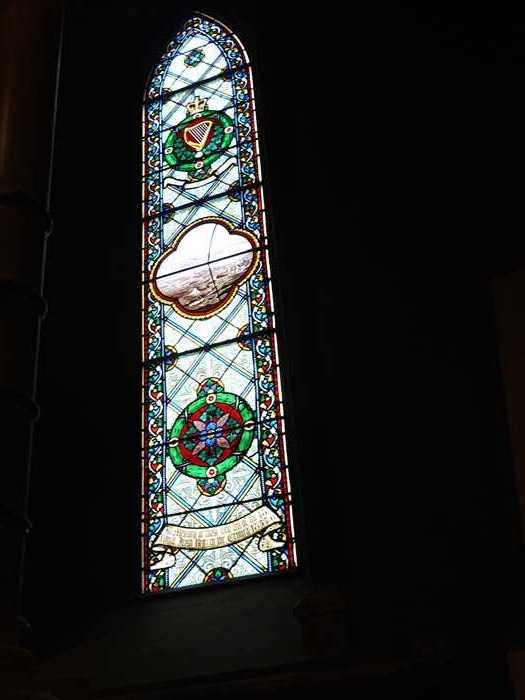 St Patrick's Cathedral・聖パトリック大聖堂の内陣の散策を続ける。配置案内図。このステンドグラスは細長い単窓構造で、物語的場面よりも象徴と紋章的モチーフを中心に構成されていた。ズームして。1.最上部の円形メダリオン ・王冠付きの金色のハープ(アイリッシュ・ハープ)が描かれていた。 ハープ:アイルランドの文化的・政治的アイデンティティの象徴。 ・アイルランドの国章であり、しばしば愛国心や民族的誇りを象徴。2.中央上部の雲型パネル ・内部に海や岸辺の景色が描かれていた。おそらく寄進者の故郷や重要な港町を表す図像。3.中央下部の円形メダリオン ・赤と青の幾何学的花模様を中心に、緑のガーランドで縁取られた装飾。 ・ケルト風のデザイン要素が見られる。 ・連合王国の花の象徴(バラ=イングランド、アザミ=スコットランド、シャムロック= アイルランド)を組み合わせたデザイン。4.最下部の帯状カートゥーシュ ・英文の献辞が描かれていた。 "In memory of those who fell on the H.M.S. Aboukir, Hogue, Cressy, 1914"(推定) この3艦は第一次世界大戦の1914年に北海で沈没した英国巡洋艦。 この窓は海軍戦没者記念として設置されたものであろうか。このステンドグラスは縦長の単窓構造で、上から下に向けて物語性と象徴性を持つ3つの主要セクションが。最上部(アーチ頂部) ・図像:小さな円形内に王冠と王笏、玉座など王権の象徴が描かれているように見える。 ・意味:神から授けられた王権、または勝利と統治の正統性の象徴。中央部(メインパネル) ・人物:中央の壮年〜老年の男性は、鎧とマントをまとい、手に長剣を持つ。 髭を蓄え、頭には冠か兜を着けている。 ・両脇:両側に青い兜と鎧を着けた護衛兵が立つ。 ・足元の文字:『King Cormac of Cashel Bishop & Martyr A.D. 908』 ・意味: ・描かれている中心人物は カッシェルのコーマック王 (Saint Cormac mac Cuilennáin, 908年没) アイルランド南部マンスターの王であり、学者・司教でもあり、戦死して殉教者と された人物 ・王冠・剣・護衛兵は王としての権威と戦いの勝利を象徴。最下段をズームして。・中央の図柄:翼を持つ天使が盾(青地に金色の獅子)を抱える構図。・盾の周囲のリボン文字: 「VIRTUTIS NAMURCENSIS PRAEMIUM」のラテン語標語. 【ナミュールの勇気への褒賞】、ナミュールは現在のベルギーの地名 と。 この標語は、1695年のナミュール包囲戦(英蘭同盟戦争中)での功績を記念するもので、 英国陸軍の一部連隊が使用した伝統的モットーです。特にロイヤル・マンスター・ フュージリアーズ連隊やその前身部隊にゆかりがある と。・左右の装飾:左上の赤い盾に金色のハープ(王冠付)、右下のドラゴン風意匠。・下部の銘文:「In memory of the Officers non-commissioned Officers and men of the Royal Irish Regiment who fell in the South African War 1899–1902.」の献辞。 【1899年から1902年の南アフリカ戦争において戦死した王立アイルランド連隊の士官・ 下士官および兵士を記念して。】画像のステンドグラスはややピンぼけしていますが、構図から判断すると、中央に白い衣の人物(おそらくキリストか聖人)が立ち、その上下に小さな場面や象徴図案が入っていた。下部にはアイルランドの象徴である金の竪琴(アイリッシュ・ハープ)が緑の背景と共に描かれているようである。下部にハープがあることから、アイルランド部隊やアイルランド出身兵士への追悼を意図している?ネットから。この窓は、聖人(多くの場合、戦士聖人や守護聖人)を上段に描き、その下に実際の戦場や兵士を描くという二段構成で、第一次世界大戦や南アフリカ戦争など、教会にゆかりのある部隊の戦没者を追悼しているのであろう。ズームして。このステンドグラス窓は、2つの主要な場面に分かれた構成になっていた。上段 ・中心人物:長い赤いマントと鎧を着た聖人または守護聖人のような人物が立って 手には長い剣を持ち、もう一方の手で盾を支えている。 ・頭部の背後には金色の後光(光輪)が描かれ、人物の聖性や象徴性を示している。 ・盾の意匠:紋章が描かれており、この窓が特定の都市・部隊・家系を記念している。 ・周囲の装飾:植物文様や幾何学模様のステンドグラスが人物を囲み、上部には青を基調 とした紋章が配置されている。下段 ・場面描写:軍服姿または歴史的服装の人物たちが描かれ、戦争や戦闘に関連した出来事を 表現している。 ・中央の人物は倒れているか、座っている兵士で、仲間に支えられている場面にも見える。 これは殉職や犠牲を象徴する図像であろうか。下部銘文 ・銘板部分に白地の文字があり、 寄進者や追悼対象(特定部隊・人物名)が記されていた。 ・「IN LOVING MEMORY OF ...」という追悼の定型文が含まれており、戦没者を記念する 軍事記念窓であることが強く示唆される。説教壇(pulpit)は石造で、ゴシック・リヴァイヴァル様式の精緻な彫刻で装飾されていた。1.三方に立つ人物像 ・聖書や巻物を持った人物像が3体。これは旧約・新約の預言者や福音書記者(Evangelists)を 象徴している