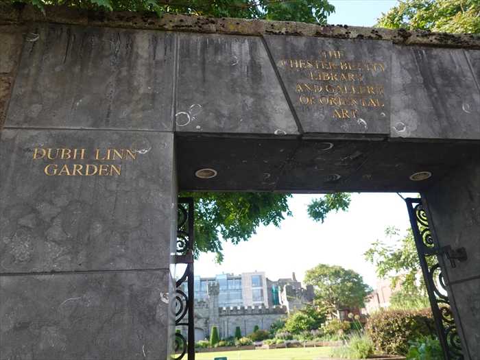 ダブリン城の敷地内にある「Dubh Linn Garden(ダブ・リン・ガーデン)」の入口に到着。左手に「DUBH LINN GARDEND(ダブ・リン庭園)「Dubh Linn」はアイルランド語で「黒い池」という意味で、ダブリンの語源」と。中央に「THE CHESTER BEATTY LIBRARY AND GALLERY OF ORIENTAL ART」と。【チェスター・ビーティー図書館および東洋美術ギャラリー】「Dubh Linn Gardens(ダブ・リン庭園)」の解説パネル。「The Dubh linn GardensThese were laid out on the site of the Dubhlinn (‘Black Pool’ in Gaelic), from which Dublin gets its name.The deep pool or harbour was formed near where the River Poddle met the River Liffey. The Norse King of Dublin and later the Anglo-Norman Lords of Dublin, the Earls ofOrmond and the English Viceroys made their stronghold on this strategically important site, selected for its defensible qualities and its direct river access to the Irish Sea.The gardens are arranged in a circular design which is inspired by early Celtic and Druidic traditions. The intricate design also includes references to traditional manuscriptdesign and to the layout of the adjoining Dubhlinn site.」 【ダブ・リン庭園この庭園は「Dubhlinn(ダブリン)」=ゲール語で「黒い池」と呼ばれる場所に造られました。現在のダブリンの地名はこの池に由来しています。この「黒い池」や天然の港は、ポドル川(River Poddle)がリフィー川(River Liffey)に合流する地点に形成されました。ダブリンのノース人の王や、その後のアングロ・ノルマン人の領主、オーモンド伯爵家、さらにイングランド王室の副王たちが、この戦略的に重要な地に拠点を築きました。この場所は、防御に適しており、アイリッシュ海への直接アクセスが可能であったことがその理由です。現在の庭園の配置は、円形デザインとなっており、これは古代ケルトやドルイド教の伝統に着想を得たものです。さらにこのデザインには、古典写本の装飾文様や、かつてここにあった「Dubhlinn(黒い池)」の位置を示す意匠も組み込まれています。】点線------の場所が「Dubh Linn Gardens(ダブ・リン庭園)」。円形の芝生広場には、ケルト風の迷路模様が描かれていた。中央には注意書きの立て札が設置されていた。「芝生には立ち入らないでください」と。 この芝生の迷路状の模様は、ケルト的な渦巻き模様(スパイラル・モチーフ)を意識したもので、Dubh Linn Garden の特徴的な意匠。訪問者が誤って模様を踏み荒らさないよう、このような注意が設けられているのであった。芝生を刈り込むと、下記の如き模様が現れるとネットの写真より。この模様は「ケルトのスパイラル(Celtic spiral)」や「ラビリンス(迷宮)」と呼ばれ、地面に直接刻まれたような形で現れるのだ と。全体が中庭を占めるほどの大スケールで、上から見下ろすことで全容が見える仕掛け。象徴的意味1. ケルト的宇宙観と再生・ケルト文化では、スパイラル(渦巻き)模様は命の循環・再生・進化を象徴します。・螺旋は生命の始まりから成長・死・再生に至る旅を表し、時間や魂の流れを可視化する象徴 とされています。2. 迷宮としての人生の旅・ラビリンス(迷宮)は、「人生の探求の道のり」を意味します。・入口と出口が一体化した構造をとることで、「行き着く先は自己の中心」という 精神的・哲学的な意味を表します。真上からの写真をネットから。アイルランドの「Garda Memorial Garden(ガーダ記念庭園)」へのもう一つの入口。この庭園は、アイルランドの国家警察である「アイルランド警察庁(An Garda Síochána)」の殉職警官を追悼するために設けられたメモリアルスペースである と。上部にアイルランド語と英語で以下の碑文が彫られていた。・GARDÍN CUIIMHNEACHÁIN AN GHARDA SÍOCHÁNA・GARDA MEMORIAL GARDEN左の石板はアイルランド警察の紋章と。・渦巻く模様と中央のハープを特徴とするこの紋章は、An Garda Síochána の公式エンブレム。・ハープはアイルランド国家の象徴であり、警察組織が国家の秩序を守る立場であることを 表している と。再び円形の芝生広場を見る。写真奥に見えるのは、ダブリン城のCoach House Gallery(コーチ・ハウス・ギャラリー)。ゴシック風の城壁風の意匠と尖塔が特徴。現代建築と並んで建っている様子は、過去と現在が共存する空間であることを象徴していた。この花はトーチリリー(Torch Lily)?それともレッドホットポーカー(Red Hot Poker)?それとも??現代的な衣装(キャップ・半ズボン・スニーカー)を身に着けた若者が、古典的彫像の切り落とされた頭部に足を乗せるという、強い象徴性と挑発的な構図を持つ現代彫刻。題名:「David and Goliath(ダビデとゴリアテ)」制作者:Jam Sutton(ジャム・サットン)古典的なダビデとゴリアテのモチーフを現代風にアレンジしたもので、ストリートウェアをまとった若いダビデがゴリアテの生首の上に座っている様子が描かれている。この作品のオリジナルは2015年制作で、カララ大理石から彫刻されています。本作品はその 3Dスキャンによる拡大レプリカで、現代で最も現代的な芸術媒体の一つである3Dプリンターを用いて制作されたのだと。こちらには「渦巻(スパイラル)モザイク彫刻」が