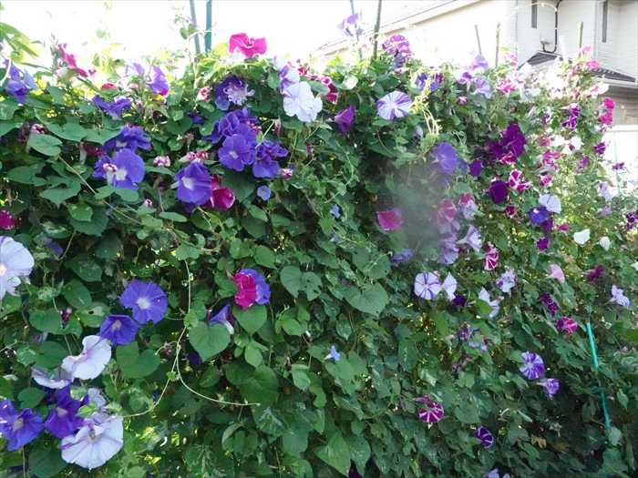 我が家の横の菜園に咲く朝顔の花です。名前の通り夏の朝に咲く花、朝顔。日本で古くから親しまれている花ですが、薬草として中国から伝わったのが始まりと言われています。江戸時代には愛好家によって品種改良が進み、観賞用として栽培されるようになりました。大輪朝顔などの人気はこのころから出始めました。鉢植えで育てることができる朝顔ですが、品種によってはグリーンカーテンとしてネットに這わせて楽しむこともできるのです。朝に咲くことから朝顔という名前が付けられましたが、朝の何時ごろに咲くかご存知ですか?日の出が関係しているように思われますが、実は、朝顔が咲く時間は前日の日没の約10時間後と言われています。夏至のころには朝顔が咲く時間は遅くなり、冬至に近づくほど日没が早まるので、朝顔の開花時間も早まります。さらに、朝顔をじっと観察すると、成長の仕方が一方向であることに気づきます。右巻きか左巻きか、ご存知でしょうか? 朝顔のツルは右巻きで生長していきます。右巻きか左巻きかは横から見て判断するので、ややこしいのですが、真上から見ると左回りに成長していきます。これは遺伝的に決まっているものだそうです。これは、大輪で美しい星咲きの花。花の中心から放射状に延びた白いすじが星のように見えるかわいらしいアサガオ。花は最大で直径10~13cmと大輪で見応えがあります。右側には、透き通るような青紫の花を咲かせる西洋大輪アサガオ。ズームして。中心は白から黄色にグラデーション。鮮やかな赤紫〜濃紫の花色。花弁の縁に白い覆輪(ふちどり)があり、華やかな印象。中心部は淡い桃色から白にグラデーションし、放射状の筋が強調されて。園芸品種によく見られる「縁取り咲き」や「絞り咲き」の変化朝顔の一種。純白の朝顔の大輪。ズームして。左の花:淡い藤色〜白に近い薄紫で、中心にかけてほんのり赤みを帯びたグラデーション。右の花:濃い紫色で、ほぼ黒に近い深い色合い。同じ株でも色合いが大きく異なる花をつけることがあり、これも「変化朝顔」や交配品種の特徴のひとつです。写真ではすでにしおれかけている花も見え、アサガオ特有の「朝に咲いて昼にしぼむ」一日花の性質が現れていたのです。「絞り咲き(しぼりざき)」と呼ばれるタイプ。紫を基調とし、白い筋や斑(まだら模様)が放射状に入っている。一枚ごとに模様の出方が異なり、まるで絵筆で描いたような芸術的な風合い。花の中心は白く抜けて、淡いグラデーションが広がっている。江戸時代の「変化朝顔」ブームでも人気が高かった咲き方。青空に映えて。中心から放射状に紫の筋模様が広がっています。紫の筋は太さや濃淡が不規則で、手描きの筆跡のように個性があります。花の中心は淡いピンクを帯び、白から紫へのグラデーションが美しい。絞り模様の入り方は一輪ごとに違うため、毎日異なる表情を見せてくれるのです。そしてこれは?アサガオではありません。これは、「花オクラ」。花オクラ(別名:トロロアオイ)は、その名の通り花を食べるエディブルフラワー(食用花)で、一般的なオクラのようなサヤではなく、淡白でオクラに似た風味と粘り気のある食感が特徴。生でサラダや和え物にするとシャキシャキした食感が楽しめ、加熱すると粘り気が増してとろりとした食感になるのです。見た目も美しく、おひたし、酢の物、天ぷらなど、幅広い料理で楽しめるのです。近づいて。オクラとよく似た美しいレモンイエローの花を咲かせる「花オクラ」。■おひたし美しい色合いを活かしておひたしにするのも定番。酢を加えたお湯でゆでると鮮やかな色を保ちやすい。加熱するととろりとした粘り気が強くなるので、オクラに似た食感も楽しめます!できたてをすし酢をかけて食べるのはもちろん、冷やして食べてもおいしいのです。■天ぷら花オクラの天ぷらもぜひ味わってみてほしい一品。花に薄く衣をつけさっと揚げましょう。花びらを一枚ずつ揚げてもよいですし、つぼみをそのまま揚げても大丈夫。サクサクの衣と粘り気のある花オクラのもっちりとした食感の違いが楽しい。ほんのりと苦味があり、オクラ特有の香りも。最後に朝顔の花が昔から日本人に愛されている理由を調べてみました。朝顔(アサガオ)は、奈良時代に中国から薬草として伝来し、平安時代以降は観賞用として日本人に広く親しまれるようになりました。日本文化に根付いた理由はいくつかあるようです。1. 花の特徴と日本人の感性・清らかさと儚さ 朝に咲き、昼にはしぼむ一日花。短い時間に鮮やかに咲く姿は、日本人が大切にする 「もののあはれ」「はかなさの美」と深く共鳴しました。・鮮やかな色彩 青・紫・桃色などの涼やかな花色は、夏の暑さの中に清涼感を与え、視覚的にも人々を 惹きつけました。2. 生活文化との結びつき・江戸時代の園芸ブーム 江戸庶民の間で「変化朝顔(葉や花びらが珍しい形になるもの)」の栽培が流行。 見世物的な人気もあ
