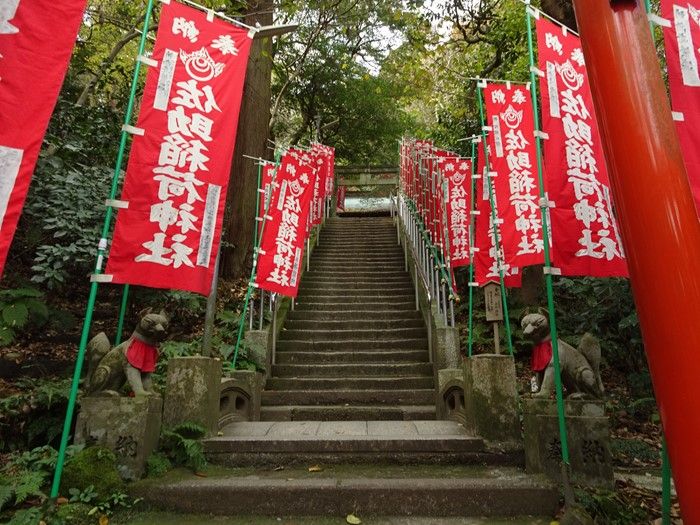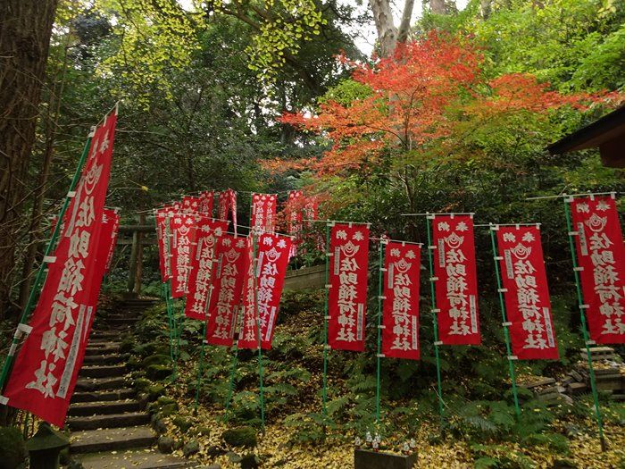 本殿に上る階段の横には真っ赤な幟がこれも両脇に。