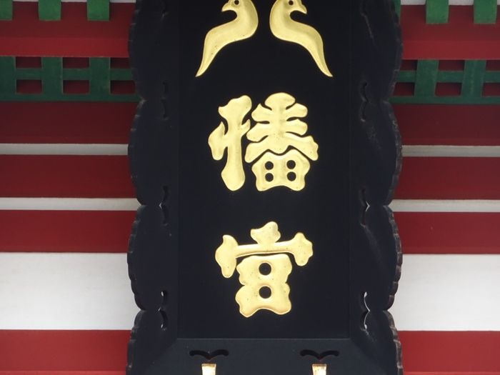 石段の上に立つ楼門にかけられている扁額(へんがく)の「八幡宮」の文字。